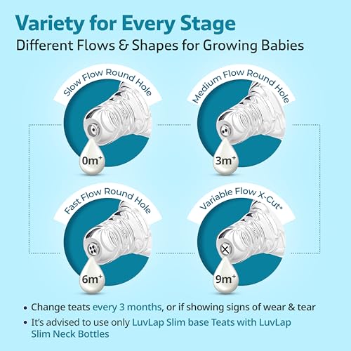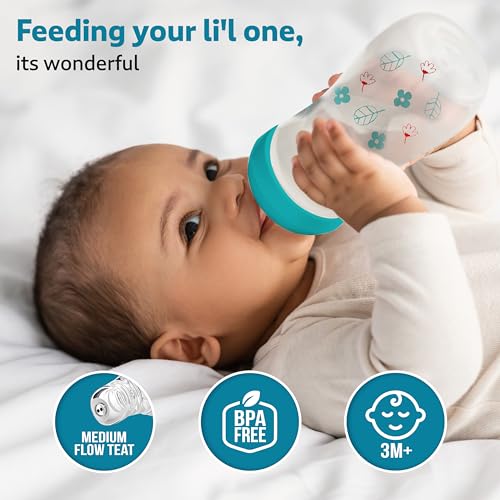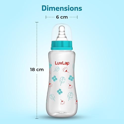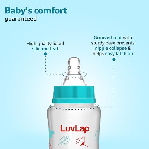 LuvLap Essential Feeding Bottles are ergonomically designed to be easily held while feeding the baby. All LuvLap bottles are 100% BPA free and fully sterilizable. The teats are 100% Liquid Silicone and have an anti-colic valve that vents air into the bottle preventing any air from entering the babys tummy. The teat has spiral grooves at the tip which encourage peristaltic suckling and help the baby get a comfortable latch. The grooved teats and superior silicone quality ensure no nipple collapse helping in an uninterrupted feed. With the LuvLap Essential Feeding Bottles at your side your babys feed will always be a comfortable one