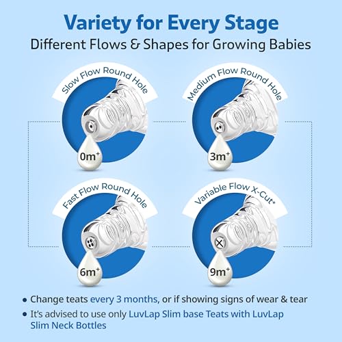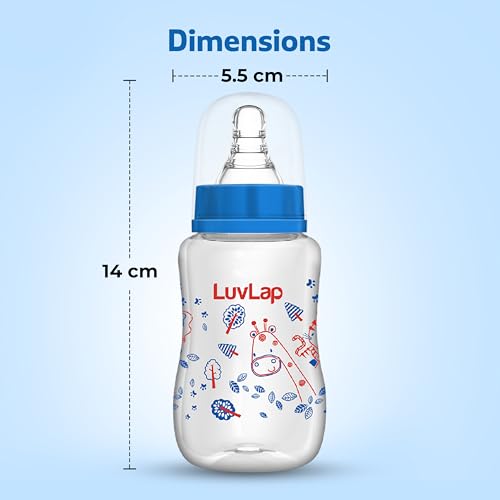 LuvLap Essential Feeding Bottles are ergonomically designed to be easily held while feeding the baby. All LuvLap bottles are 100% BPA free and fully sterilizable. The teats are 100% Liquid Silicone and have an anti-colic valve that vents air into the bottle preventing any air from entering the babys tummy. The teat has spiral grooves at the tip which encourage peristaltic suckling and help the baby get a comfortable latch. The grooved teats and superior silicone quality ensure no nipple collapse helping in an uninterrupted feed. With the LuvLap Essential Feeding Bottles at your side your babys feed will always be a comfortable one