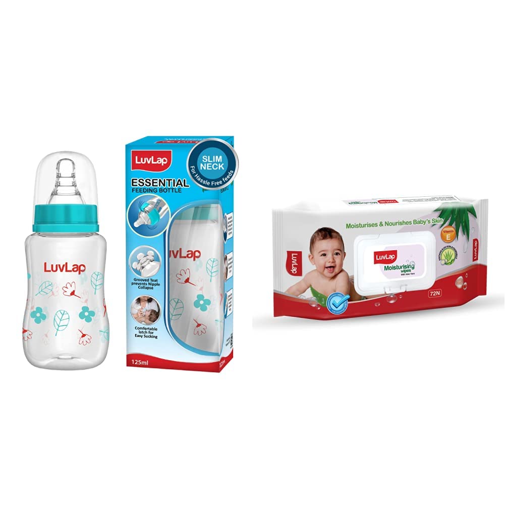 Luvlap Anti-Colic Slim Wild Flowers BPA-free Regular Neck Baby Feeding Bottle 125ml GreenLuvLap Essential Feeding Bottles are ergonomically designed to be easily held while feeding the baby. All LuvLap bottles are 100% BPA free and fully sterilizable. The teats are 100% Liquid Silicone and have an anti-colic valve that vents air into the bottle preventing any air from entering the baby?s tummy. The teat has spiral grooves at the tip which encourage peristaltic suckling and help the baby get a comfortable latch. The grooved teats and superior silicone quality ensure no nipple collapse helping in an uninterrupted feed. With the LuvLap Essential Feeding Bottles at your side your baby?s feed will always be a comfortable oneLuvLap Paraben Free wipes for baby skin with Aloe Vera Fragrance Free pH Balanced Dermatologically Safe Baby Wipes Rich in Vitamin E & chamomile extract 72 Wipes With Lid PackLuvLap Moisturizing Baby Wipes with aloe vera are the perfect wipes for your baby's delicate skin. Enriched with the goodness of Aloe Vera & Chamomile they are completely free of alcohol and harmful parabens. The pack also comes with a lid seal to ensure the quality remains consistent over time. After all your baby's safety is our prime concern.