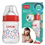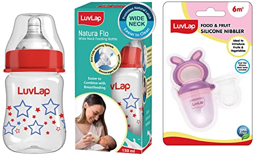 Luvlap Anti-Colic Wide Neck Natura Flo Baby Feeding Bottle 150ml New Born/Infants/Toddler Upto 3 Years Stars BPA FreeLuvLap Natura Flow Feeding Bottles are ergonomically designed to be easily held while feeding the baby. All LuvLap bottles are 100% BPA free and fully sterilizable. The teats are 100% Liquid Silicone and have an anti-colic valve that vents air into the bottle preventing any air from entering the babys tummy. The teat has grooves at the tip which encourage peristaltic suckling while the wide base helps the baby get a natural latch similar to that on the mothers breast. This helps easy transition between breastfeeding & bottle feeding. The grooved teats and superior silicone quality ensure no nipple collapse helping in an uninterrupted feed.LuvLap Bunny Food & fruit nibblerFruit nibbler and teething toy to provide gentle relief to gums. Serves dual purpose of feeding fruit and vegetables to babies and can also be used as a teether. Can be filled with chilled fruits/vegetables to provide added relief. Made with bpa free food grade plastic and soft silicone it comes in attractive handle designs to EN gage the baby and is easy to hold and nibble upon.