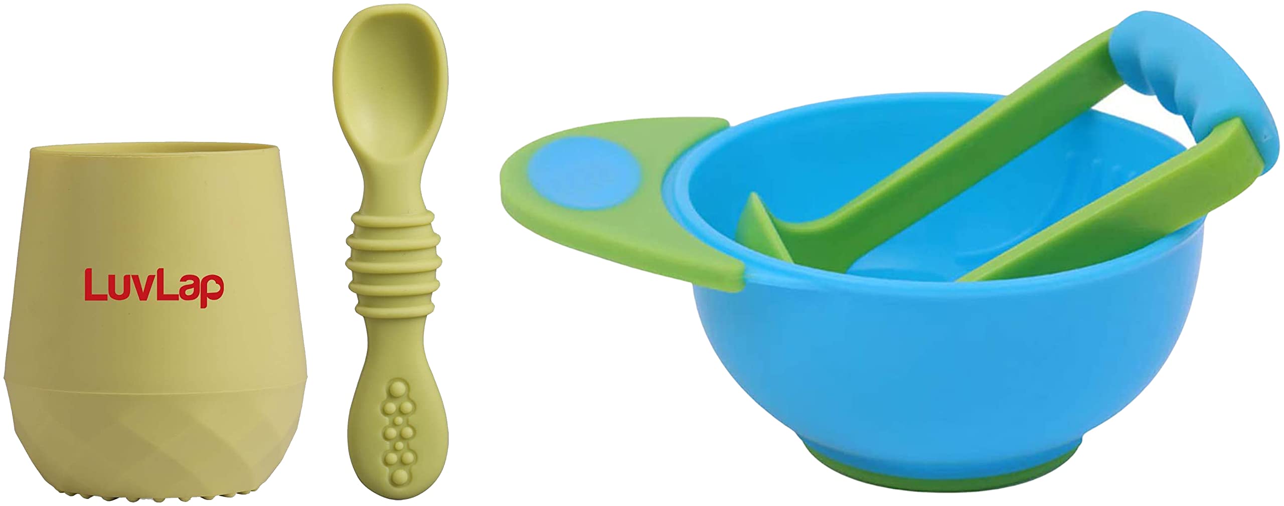 LuvLap Baby & Toddler Silicone Spoon & Training Cup Set 100% Food Grade Silicone Unbreakable BPA & Plastic Free Baby Led Weaning Utensil Baby Shower GiftBaby weaning is one of the most important aspects of baby's growth. And you would like to have utensils which suit their requirement perfectly. LuvLap designs its weaning utensils with food grade Silicone which is plastic and BPA free so that they are not harmed. Also the Silicone doesn't hurt their delicate gums and mouth and thus they enjoy their meals completely. These are sterilizable and thus there is no fear of contamination. Also these are ergonomic and thus babies can hold the easilyLuvLap Baby Food Grinding Cum Feeding Bowl Portable Baby Food Masher & Serving Bowl for Baby weaning Food Preparation (Green & Blue)LuvLap LuvLap Baby Food Grinding cum Feeding Bowl is Made of BPA Free PP material. It is nontoxic odor free and tasteless. It can be used to grind fruits & vegetables meat and fishes into smooth paste and pureed food. It is easy to clean. Just rinse it with running water & let it dry