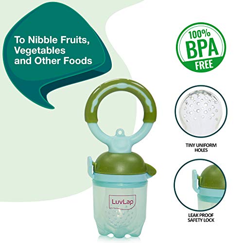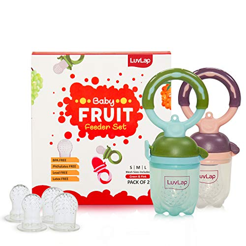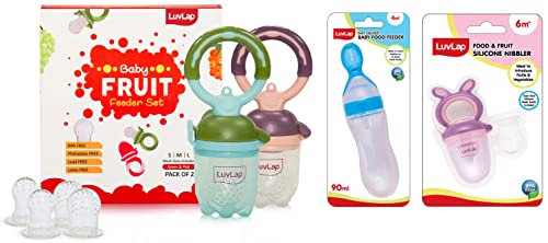 LuvLap Baby food and fruit feeder twin pack with three Feeder Sack sizes BPA Free Green & PinkLuvLap Baby food and fruit feeder twin packs are availble in attractive colors ergonomic designs and makes baby's introduction to solid food and feeding to weaning babies an easiser job. The pack contains 3 different sizes of feeder sack to meet the growing consumption need of the babiesLuvLap Bunny Food & fruit nibblerFruit nibbler and teething toy to provide gentle relief to gums. Serves dual purpose of feeding fruit and vegetables to babies and can also be used as a teether. Can be filled with chilled fruits/vegetables to provide added relief. Made with bpa free food grade plastic and soft silicone it comes in attractive handle designs to EN gage the baby and is easy to hold and nibble upon.LuvLap Feeding Spoon with Squeezy food Grade Silicone Feeder bottle For Infant Baby 90ml BPA FreeBlueSoft Silicone food feeding bottle with spoon can be used to feed puries juice milk or water to babies. Helps in easy transition. Effortless one hand feeding. Dust cover and disk make it easy to keep and carry.