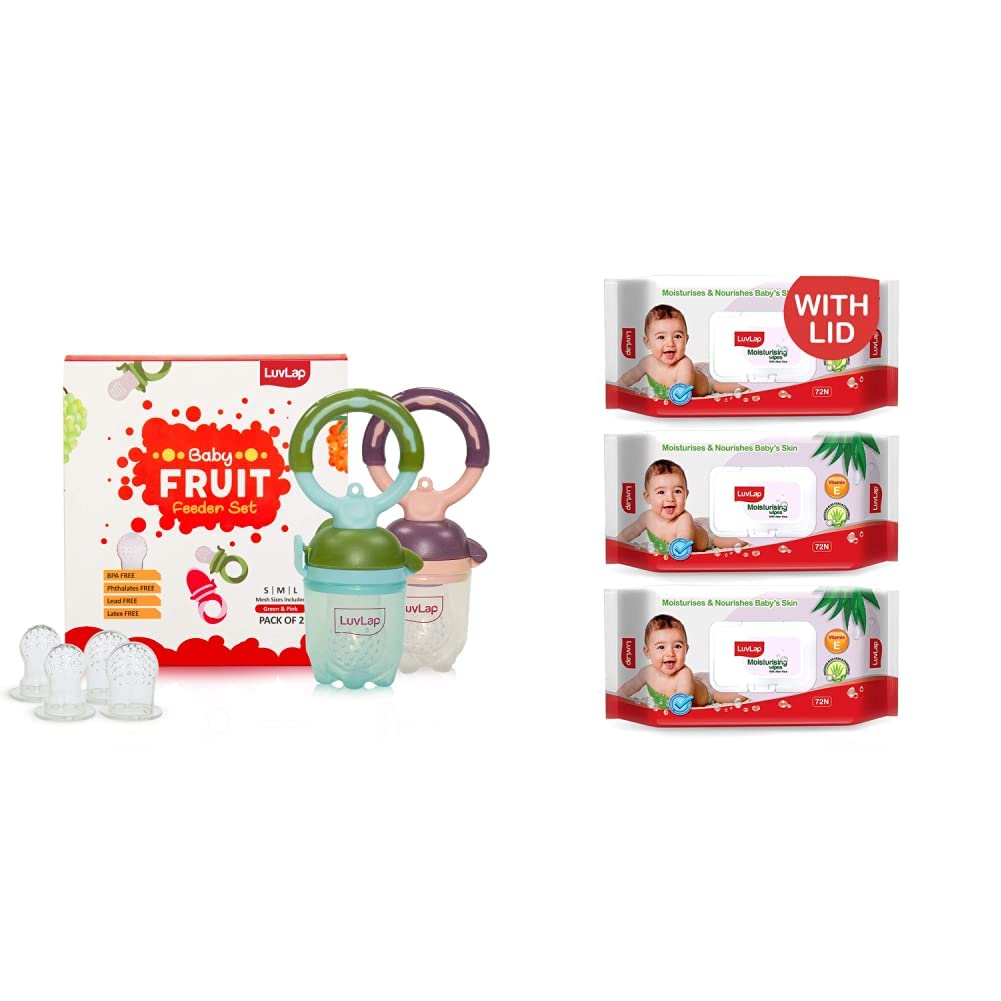 LuvLap Baby food and fruit feeder twin pack with three Feeder Sack sizes BPA Free Green & PinkLuvLap Baby food and fruit feeder twin packs are availble in attractive colors ergonomic designs and makes baby's introduction to solid food and feeding to weaning babies an easiser job. The pack contains 3 different sizes of feeder sack to meet the growing consumption need of the babiesLuvLap Paraben Free wipes for baby skin with Aloe Vera Fragrance Free pH Balanced Dermatologically Safe Baby Wipes Rich in Vitamin E & chamomile extract 72 Wipes / Pack With Lid Pack 3 packsLuvLap moisturizing baby wipes with aloe vera are the perfect wipes for your baby's delicate skin. Enriched with the goodness of aloe vera and chamomile they are completely free of alcohol and harmful parabens. The pack also comes with a lid seal to ensure the quality remains consistent over time. After all your baby's safety is our prime concern.