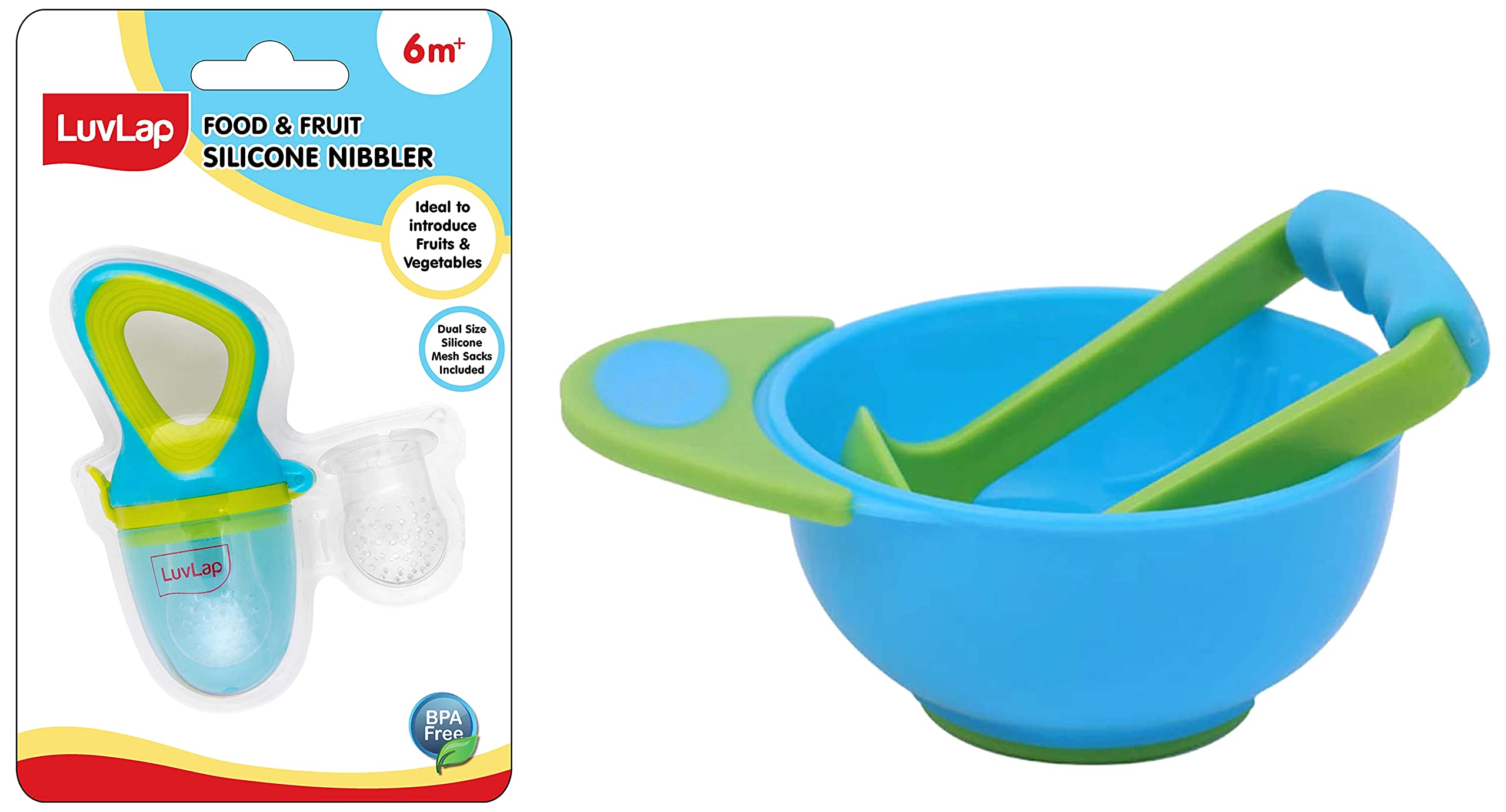 LuvLap Baby Food Grinding Cum Feeding Bowl Portable Baby Food Masher & Serving Bowl for Baby weaning Food Preparation (Green & Blue)LuvLap LuvLap Baby Food Grinding cum Feeding Bowl is Made of BPA Free PP material. It is nontoxic odor free and tasteless. It can be used to grind fruits & vegetables meat and fishes into smooth paste and pureed food. It is easy to clean. Just rinse it with running water & let it dryLuvLap Silicone Food/Fruit Nibbler with Extra Mesh Soft Pacifier/Feeder Teether for Infant Baby Infant Elegant Blue BPA FreeFruit nibbler and teething toy to provide gentle relief to gums. Serves dual purpose of feeding fruit and vegetables to babies and can also be used as a teether. Can be filled with chilled fruits/vegetables to provide added relief. Made with bpa free food grade plastic and soft silicone it comes in attractive handle designs to EN gage the baby and is easy to hold and nibble upon.