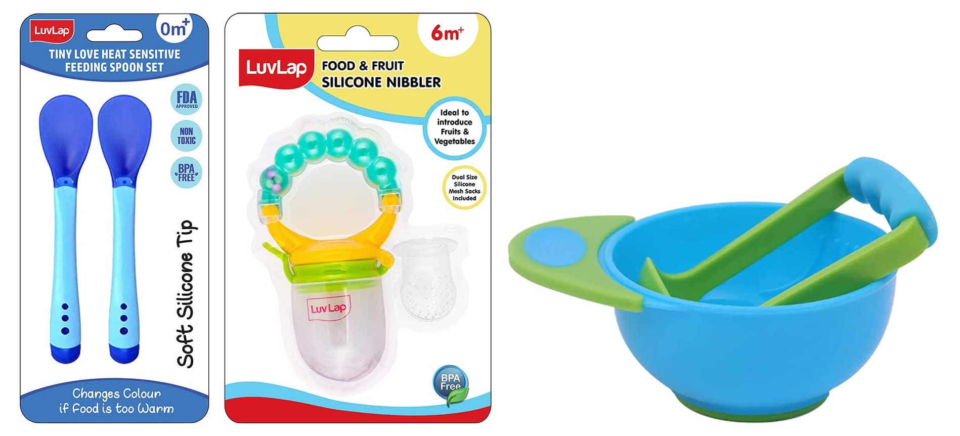 LuvLap Baby Food Grinding Cum Feeding Bowl Portable Baby Food Masher & Serving Bowl for Baby weaning Food Preparation (Green & Blue)LuvLap LuvLap Baby Food Grinding cum Feeding Bowl is Made of BPA Free PP material. It is nontoxic odor free and tasteless. It can be used to grind fruits & vegetables meat and fishes into smooth paste and pureed food. It is easy to clean. Just rinse it with running water & let it dryLuvLap Tiny Love Heat Sensitive Baby Feeding Spoons Set Food Grade PP Kids & Baby Spoon with Soft Silicone Tip Color changing BPA Free FDA Apporved 2 pcs BlueLifeÂs little stories bloom with coming of the little one in your life. It completes your life with many joys of parenthood. For baby itÂs the next best thing to being in your arms. Entertain your little one and give him or her a personal resting place. LuvlapÂs high chairs cots walkers and other indoor products will have the whole household floored by babyÂs happy smiles and chuckles. At Luvlap we endeavour to weave the little stories into our products with an emphasis on child safety and enrichment of features. So that your little one gets the comfort thatÂs next only to the warmth of your lap. Conceived with care and made using the latest marvels of science all Luvlap products undergo multiple quality checks before they are dispatched to the stores. The products are available at all leading baby gear and online stores and conform to the european standards.LuvLap Pearly Food & Fruit NibblerFruit nibbler and teething toy to provide gentle relief to gums. Serves dual purpose of feeding fruit and vegetables to babies and can also be used as a teether. Can be filled with chilled fruits/vegetables to provide added relief. Made with bpa free food grade plastic and soft silicone it comes in attractive handle designs to EN gage the baby and is easy to hold and nibble upon