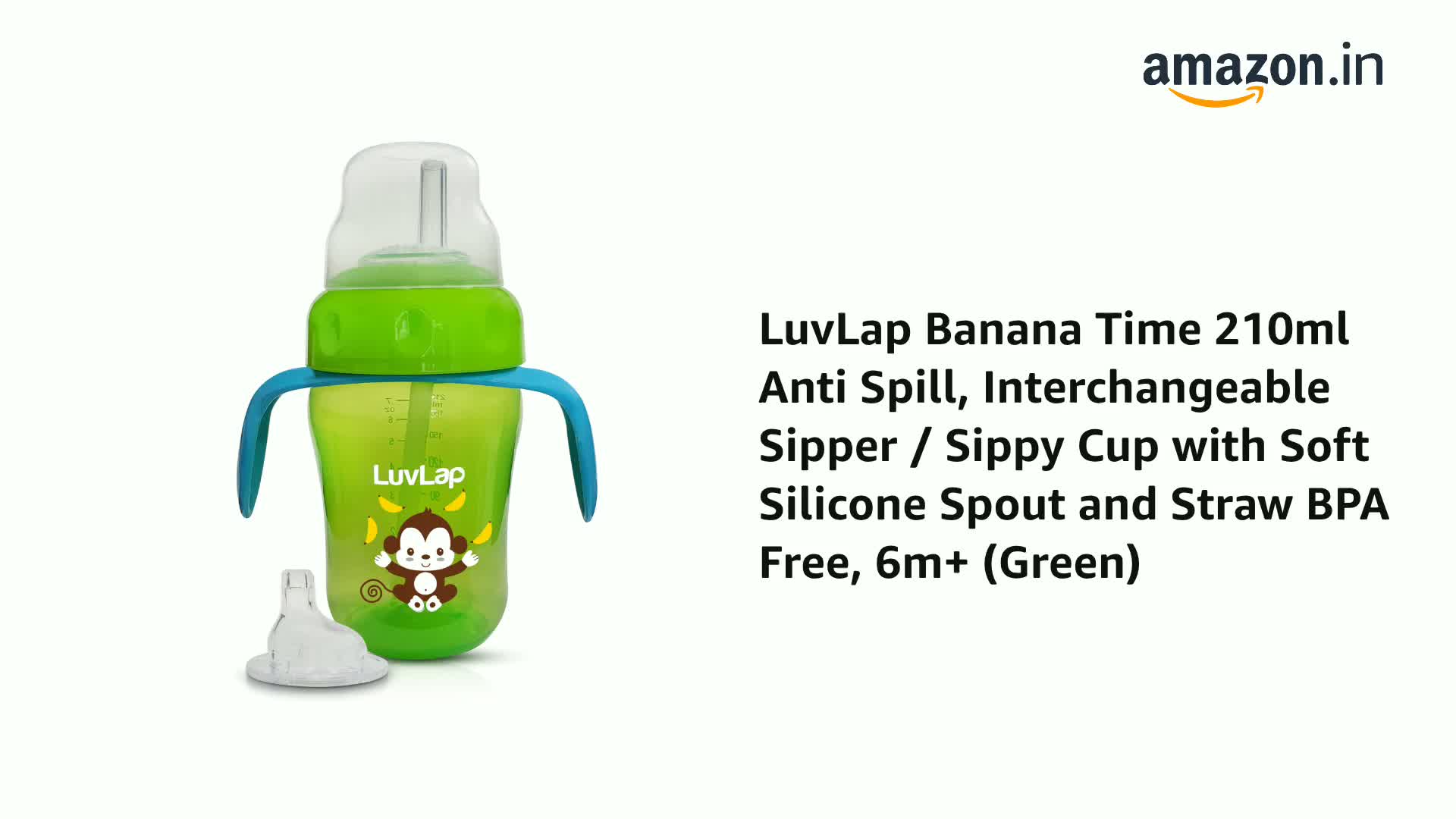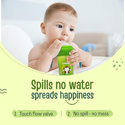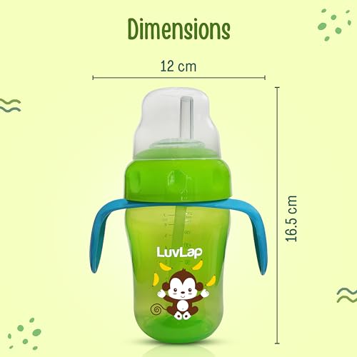 LuvLap Banana Time Sipper helps through baby's transition stages to drink independently. It comes with both a spout and a straw to support two stages of transition. The handles are also designed as per baby's little hands and are detachable as well to suit the baby's preference and needs. Built in touch-flow valve allows baby led drinking and helps avoid any spills or mess. All parts are sterilizer safe and BPA free