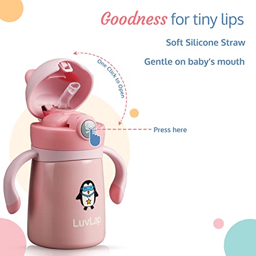 LuvLap Steel Straw Sipper Cups are for ideal for baby and Toddlers' liquid consumption. The Double Walled body retains the temperature of liquid for long duration. The straw of the sipper is made of food grade sterilizable Silicone. The starw is byte resistant. The body of the sipper is made of high quality rust free SS304 steel. It is odour free also. The detachable handles are very easy to grip.