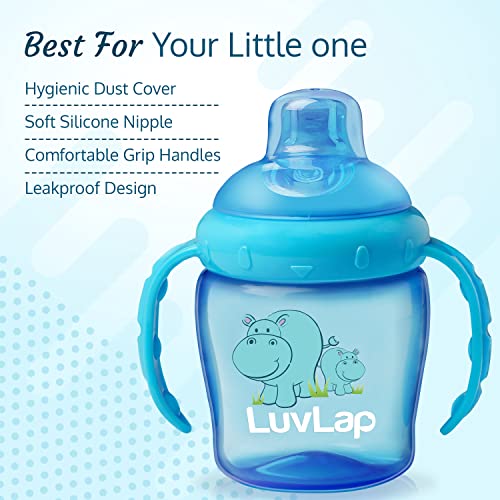 LuvLap Feeding Spoon with Squeezy food Grade Silicone Feeder bottle For Infant Baby 180ml BPA FreeSoft silicone food feeding bottle with spoon can be used to feed puries juice milk or water to babies. Helps in easy transition. Effortless one hand feeding. Extra soft silicone spoon protects baby's teeth. Dust cover to maintain hygiene.LuvLap Hippo Sipper BlueLuvLap Hippo Spout Sippers are meant for babies' of 6 month + age. The sipper comes with an intelligent spout with touch flo valve which ensures zero spillage. The sipper is made up of BPA free plastic.