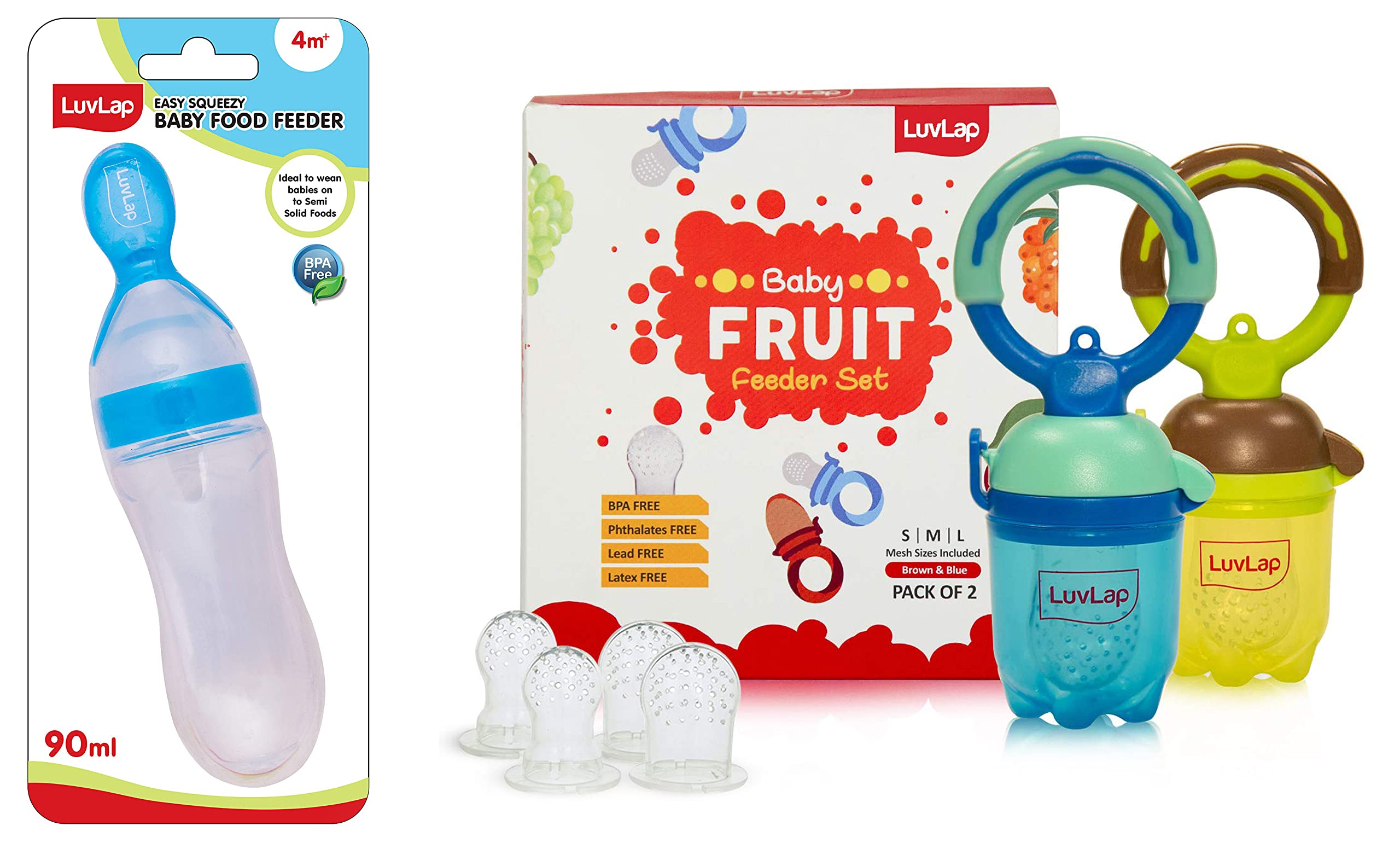 LuvLap Feeding Spoon with Squeezy food Grade Silicone Feeder bottle For Infant Baby 90ml BPA FreeBlueSoft Silicone food feeding bottle with spoon can be used to feed puries juice milk or water to babies. Helps in easy transition. Effortless one hand feeding. Dust cover and disk make it easy to keep and carry.LuvLap Baby Food and Fruit Feeder Twin Pack with Three Feeder Sack Sizes BPA Free Brown and BlueLuvLap Baby food and fruit feeder twin packs are availble in attractive colors ergonomic designs and makes baby's introduction to solid food and feeding to weaning babies an easiser job. The pack contains 3 different sizes of feeder sack to meet the growing consumption need of the babies
