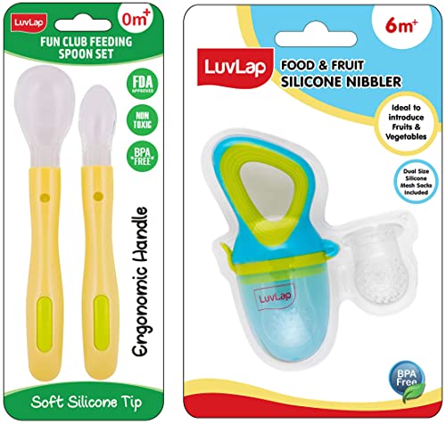 Luvlap Fun Club Baby Silicone Spoon Set BPA Free FDA Approved 2 pcs GreenLifes little stories bloom with coming of the little one in your life. It completes your life with many joys of parenthood. For baby its the next best thing to being in your arms. Entertain your little one and give him or her a personal resting place. Luvlaps high chairs cots walkers and other indoor products will have the whole household floored by babys happy smiles and chuckles. At Luvlap we endeavour to weave the little stories into our products with an emphasis on child safety and enrichment of features. So that your little one gets the comfort thats next only to the warmth of your lap. Conceived with care and made using the latest marvels of science all Luvlap products undergo multiple quality checks before they are dispatched to the stores. The products are available at all leading baby gear and online stores and conform to the european standards.LuvLap Silicone Food/Fruit Nibbler with Extra Mesh Soft Pacifier/Feeder Teether for Infant Baby Infant Elegant Blue BPA FreeFruit nibbler and teething toy to provide gentle relief to gums. Serves dual purpose of feeding fruit and vegetables to babies and can also be used as a teether. Can be filled with chilled fruits/vegetables to provide added relief. Made with bpa free food grade plastic and soft silicone it comes in attractive handle designs to EN gage the baby and is easy to hold and nibble upon.