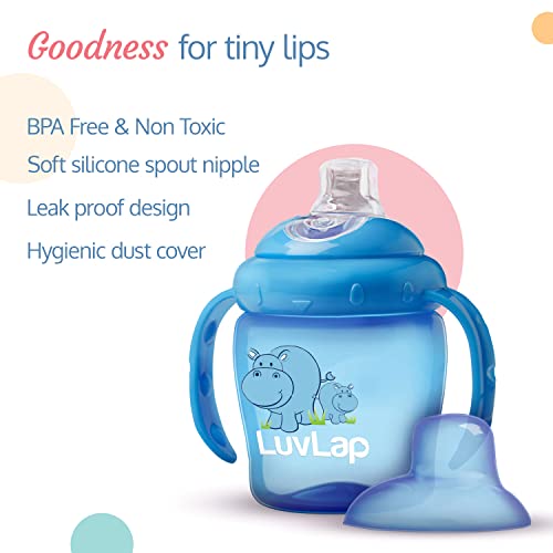 Luvlap Hippo Sipper / Sippy Cup 225ml Anti-Spill Design with Soft Silicone Spout 6m+ (Orange)LuvLap Hippo Sipper 225ml - OrangeLuvlap Hippo Sipper / Sippy Cup 225ml Anti-Spill Design with Soft Silicone Spout 6m+ (Green)Luvlap hippo sipper with soft silicon spout is ideal for your 6 months plus baby. The soft silicon spout helps in overall oral development of your child. It has an in-built valve which makes it non- spill and leak proof preventing any unwanted spilling and mess.