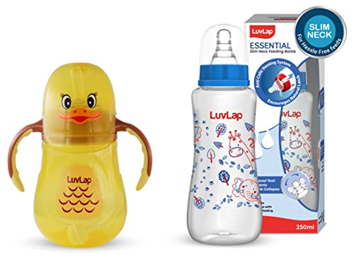 LuvLap Naughty Duck Sipper / Sippy Cup 280ml Anti-Spill Design with Soft Silicone Straw 12m+ (Yellow)LuvLap naughty duck straw sipper comes with a spill proof weighted straw. Weighted straw allows child to drink at any angle easily. Ergonomically designed easy grip handles are specially designed as per requirement of small baby hands.Luvlap Slim Neck Essential Baby Feeding Bottle 250ml Jungle TalesLuvLap Essential Feeding Bottles are ergonomically designed to be easily held while feeding the baby. All LuvLap bottles are 100% BPA free and fully sterilizable. The teats are 100% Liquid Silicone and have an anti-colic valve that vents air into the bottle preventing any air from entering the babys tummy. The teat has spiral grooves at the tip which encourage peristaltic suckling and help the baby get a comfortable latch. The grooved teats and superior silicone quality ensure no nipple collapse helping in an uninterrupted feed. With the LuvLap Essential Feeding Bottles at your side your babys feed will always be a comfortable one