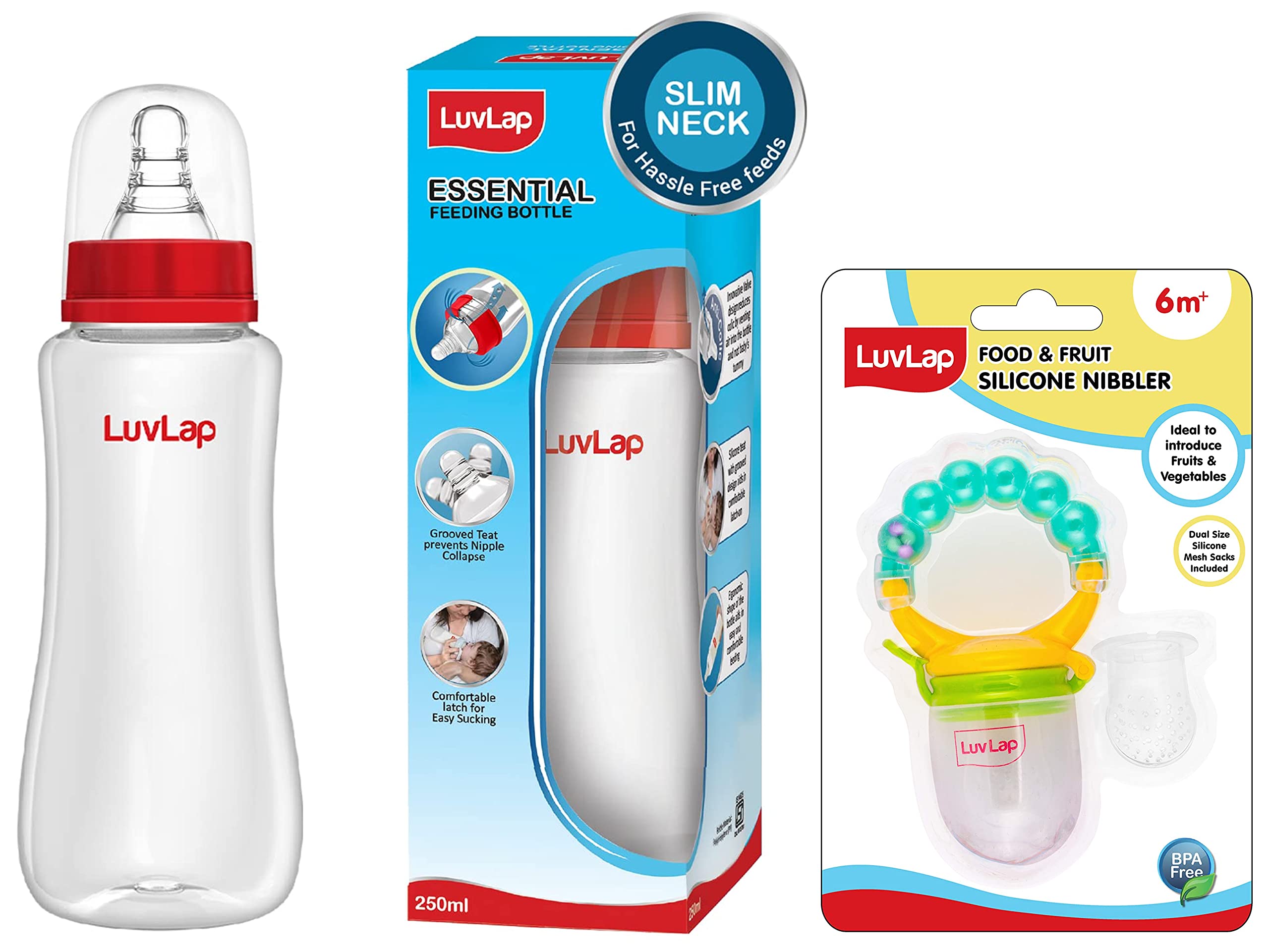 LuvLap Pearly Food & Fruit NibblerFruit nibbler and teething toy to provide gentle relief to gums. Serves dual purpose of feeding fruit and vegetables to babies and can also be used as a teether. Can be filled with chilled fruits/vegetables to provide added relief. Made with bpa free food grade plastic and soft silicone it comes in attractive handle designs to EN gage the baby and is easy to hold and nibble uponLuvLap Anti-Colic Slim/Regular Neck Essential Baby Feeding Bottle 250ml New Born/Infants/Toddler Upto 3 Years BPA FreeLuvLap Essential Feeding Bottles are ergonomically designed to be easily held while feeding the baby. All LuvLap bottles are 100% BPA free and fully sterilizable. The teats are 100% Liquid Silicone and have an anti-colic valve that vents air into the bottle preventing any air from entering the babys tummy. The teat has spiral grooves at the tip which encourage peristaltic suckling and help the baby get a comfortable latch. The grooved teats and superior silicone quality ensure no nipple collapse helping in an uninterrupted feed. With the LuvLap Essential Feeding Bottles at your side your babys feed will always be a comfortable one