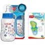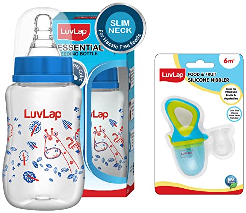 LuvLap Silicone Food/Fruit Nibbler with Extra Mesh Soft Pacifier/Feeder Teether for Infant Baby Infant Elegant Blue BPA FreeFruit nibbler and teething toy to provide gentle relief to gums. Serves dual purpose of feeding fruit and vegetables to babies and can also be used as a teether. Can be filled with chilled fruits/vegetables to provide added relief. Made with bpa free food grade plastic and soft silicone it comes in attractive handle designs to EN gage the baby and is easy to hold and nibble upon.Luvlap Anti-Colic Slim Regular Neck Essential BPA-free Baby Feeding Bottle 125ml BlueLuvLap Essential Feeding Bottles are ergonomically designed to be easily held while feeding the baby. All LuvLap bottles are 100% BPA free and fully sterilizable. The teats are 100% Liquid Silicone and have an anti-colic valve that vents air into the bottle preventing any air from entering the babys tummy. The teat has spiral grooves at the tip which encourage peristaltic suckling and help the baby get a comfortable latch. The grooved teats and superior silicone quality ensure no nipple collapse helping in an uninterrupted feed. With the LuvLap Essential Feeding Bottles at your side your babys feed will always be a comfortable one