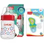 LuvLap Silicone Food/Fruit Nibbler with Extra Mesh Soft Pacifier/Feeder Teether for Infant Baby Infant Elegant Blue BPA FreeFruit nibbler and teething toy to provide gentle relief to gums. Serves dual purpose of feeding fruit and vegetables to babies and can also be used as a teether. Can be filled with chilled fruits/vegetables to provide added relief. Made with bpa free food grade plastic and soft silicone it comes in attractive handle designs to EN gage the baby and is easy to hold and nibble upon.Luvlap Anti-Colic Wide Neck Natura Flo Baby Feeding Bottle 150ml New Born / Infants / Toddler upto 3 years Stars BPA Free Pack of 1 Light BlueLuvLap Natura Flow Feeding Bottles are ergonomically designed to be easily held while feeding the baby. All LuvLap bottles are 100% BPA free and fully sterilizable. The teats are 100% Liquid Silicone and have an anti-colic valve that vents air into the bottle preventing any air from entering the babys tummy. The teat has grooves at the tip which encourage peristaltic suckling while the wide base helps the baby get a natural latch similar to that on the mothers breast. This helps easy transition between breastfeeding & bottle feeding. The grooved teats and superior silicone quality ensure no nipple collapse helping in an uninterrupted feed.