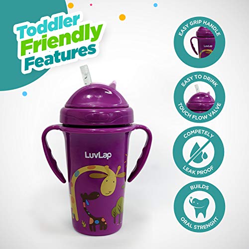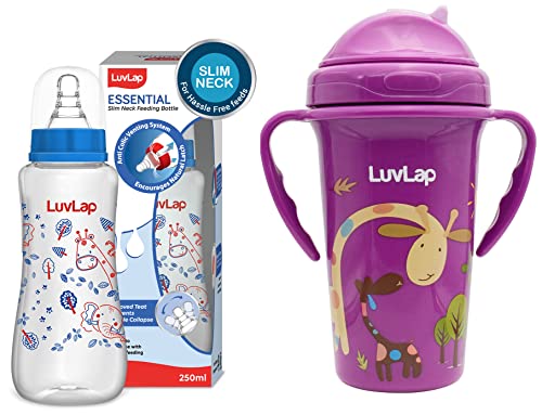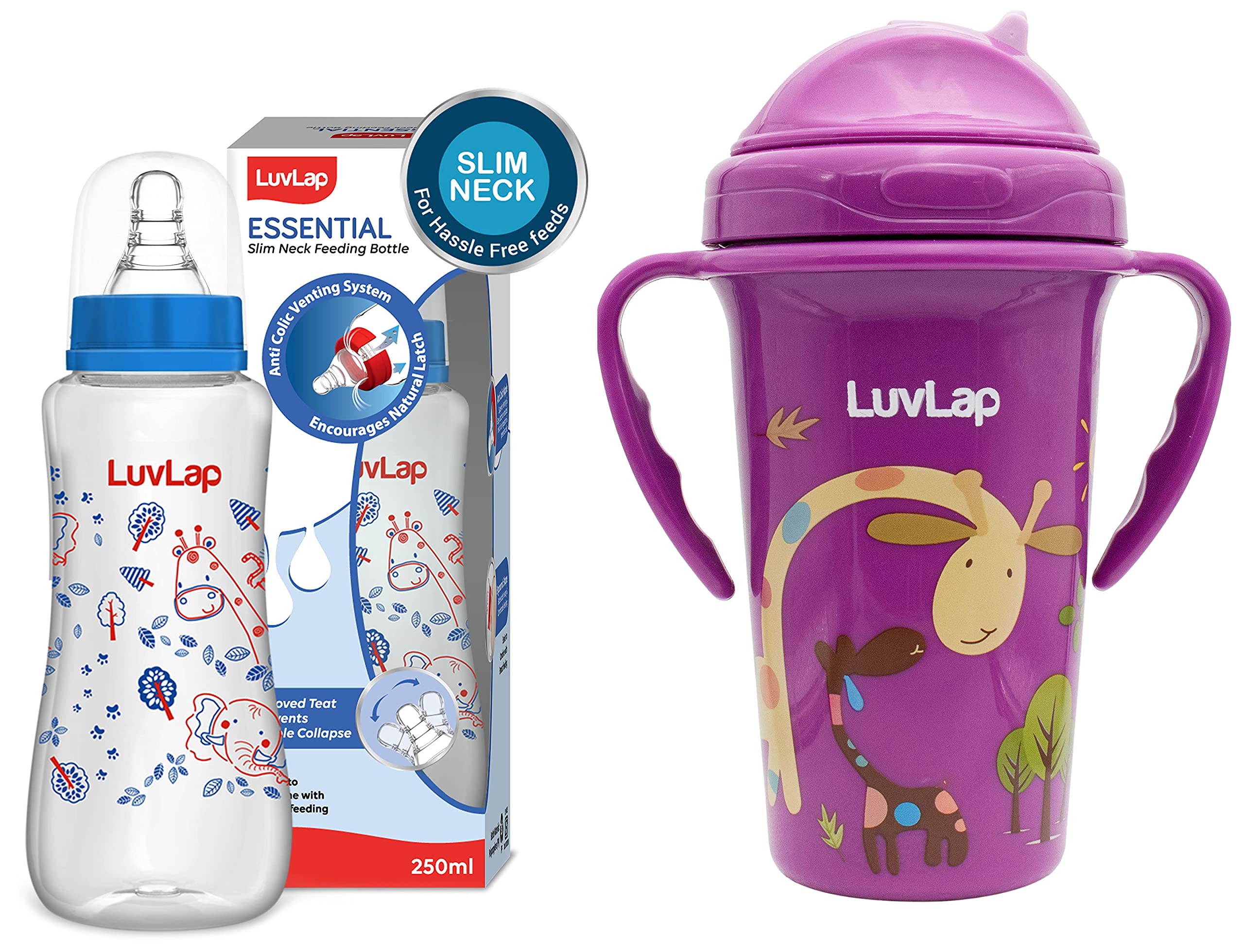 LuvLap Tiny Giffy Sipper / Sippy Cup 300ml Anti-Spill Design with Soft Silicone Straw 18m+ (Purple)Attractive sippers in various designs and colours. Made from non toxic BPA free plastic and soft silicone. Silicone straw helps in building oral strength. Ergonomically designed easy to hold and drink from.Luvlap Slim Neck Essential Baby Feeding Bottle 250ml Jungle TalesLuvLap Essential Feeding Bottles are ergonomically designed to be easily held while feeding the baby. All LuvLap bottles are 100% BPA free and fully sterilizable. The teats are 100% Liquid Silicone and have an anti-colic valve that vents air into the bottle preventing any air from entering the babys tummy. The teat has spiral grooves at the tip which encourage peristaltic suckling and help the baby get a comfortable latch. The grooved teats and superior silicone quality ensure no nipple collapse helping in an uninterrupted feed. With the LuvLap Essential Feeding Bottles at your side your babys feed will always be a comfortable one