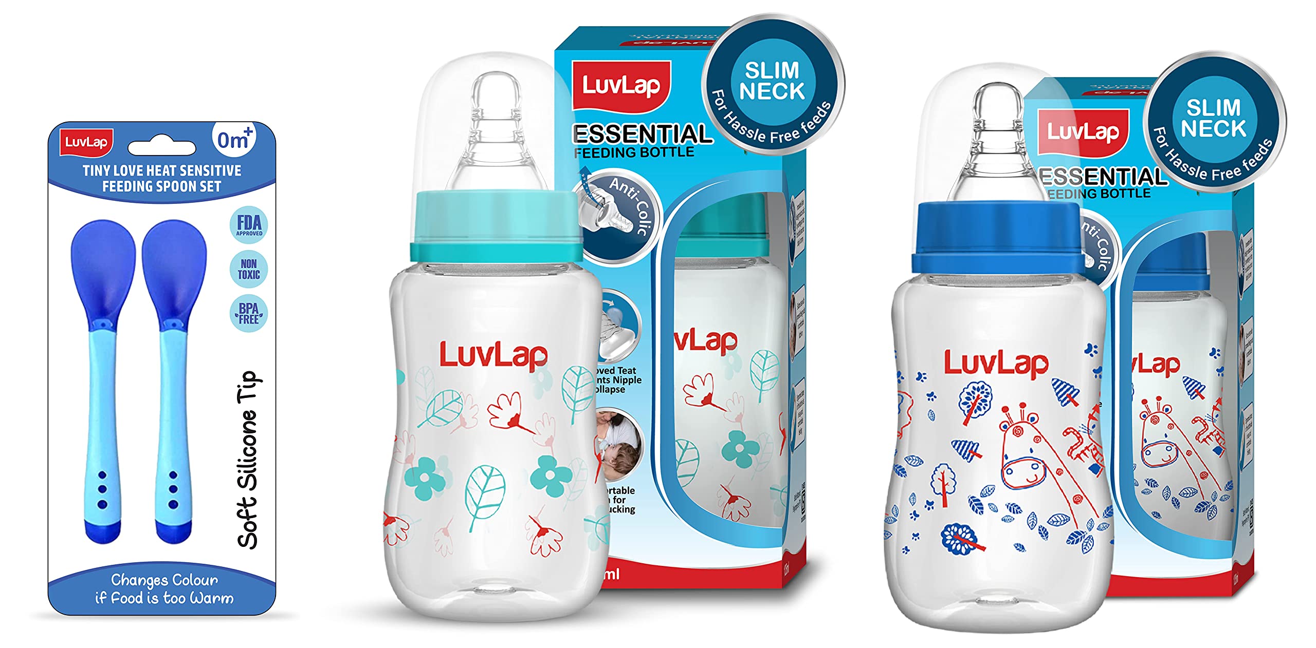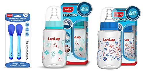 LuvLap Tiny Love Heat Sensitive Baby Feeding Spoons Set Food Grade PP Kids & Baby Spoon with Soft Silicone Tip Color changing BPA Free FDA Apporved 2 pcs BlueLifeÂs little stories bloom with coming of the little one in your life. It completes your life with many joys of parenthood. For baby itÂs the next best thing to being in your arms. Entertain your little one and give him or her a personal resting place. LuvlapÂs high chairs cots walkers and other indoor products will have the whole household floored by babyÂs happy smiles and chuckles. At Luvlap we endeavour to weave the little stories into our products with an emphasis on child safety and enrichment of features. So that your little one gets the comfort thatÂs next only to the warmth of your lap. Conceived with care and made using the latest marvels of science all Luvlap products undergo multiple quality checks before they are dispatched to the stores. The products are available at all leading baby gear and online stores and conform to the european standards.Luvlap Anti-Colic Slim Wild Flowers BPA-free Regular Neck Baby Feeding Bottle 125ml GreenLuvLap Essential Feeding Bottles are ergonomically designed to be easily held while feeding the baby. All LuvLap bottles are 100% BPA free and fully sterilizable. The teats are 100% Liquid Silicone and have an anti-colic valve that vents air into the bottle preventing any air from entering the baby?s tummy. The teat has spiral grooves at the tip which encourage peristaltic suckling and help the baby get a comfortable latch. The grooved teats and superior silicone quality ensure no nipple collapse helping in an uninterrupted feed. With the LuvLap Essential Feeding Bottles at your side your baby?s feed will always be a comfortable oneLuvlap Anti-Colic Slim Regular Neck Essential BPA-free Baby Feeding Bottle 125ml BlueLuvLap Essential Feeding Bottles are ergonomically designed to be easily held while feeding the baby. All LuvLap bottles are 100% BPA free and fully sterilizable. The teats are 100% Liquid Silicone and have an anti-colic valve that vents air into the bottle preventing any air from entering the babys tummy. The teat has spiral grooves at the tip which encourage peristaltic suckling and help the baby get a comfortable latch. The grooved teats and superior silicone quality ensure no nipple collapse helping in an uninterrupted feed. With the LuvLap Essential Feeding Bottles at your side your babys feed will always be a comfortable one