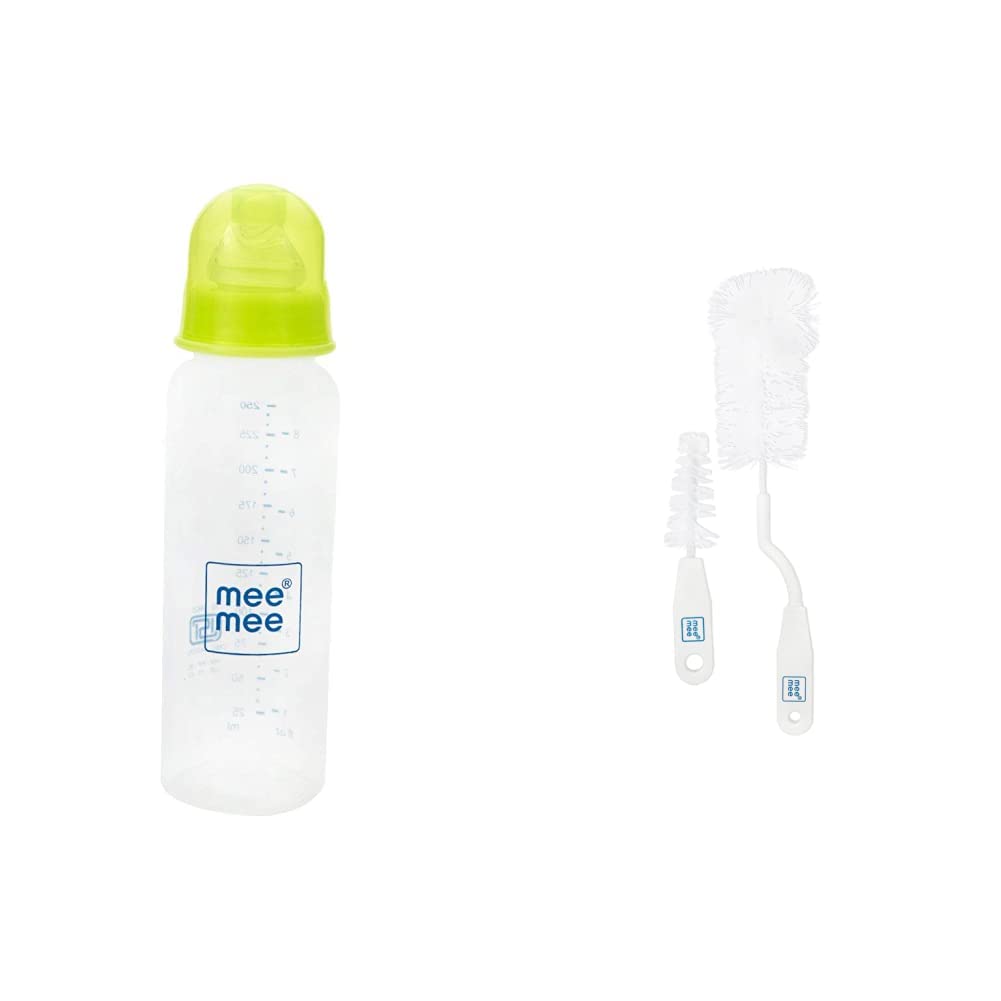 Mee Mee 250ml Eazy Flo Premium Baby Feeding Bottle (Green)A Well-Fed baby is a happy baby. Mee Mee's Baby Feeding Bottle gives your baby the most comfortable feeding experience with the right intake of feed and reduced air intake through its specially designed anti-colic nipple.Mee Mee Bottle and Nipple Cleaning Brush (White)Baby's health is a constant source of worry for every parent. A clean feeding bottle and nipple is the best precaution against disease. Mee Mee Bottle and Nipple Cleaning Brush is the ideal tool to ensure that your baby's feeding bottle and other accessories are perfectly clean and safe for regular use. The unique '360 rotating handle' ensure that you can clean more without your wrists getting strained.