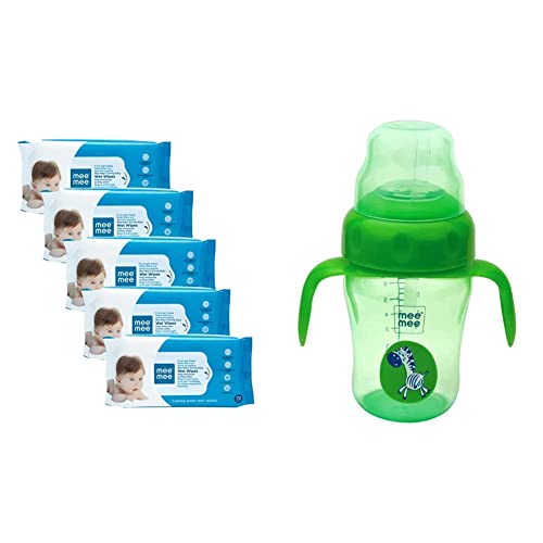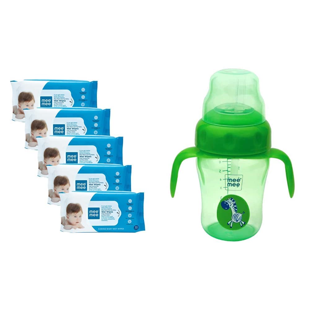 Mee Mee Baby Gentle Wet Wipes with Aloe Vera extracts |72 pcs| Pack of 5Babies have extremely soft and delicate skin and even if they are exposed to a moment of pollution or dirt it can cause multiple damage to their skin. Mee Mee best known for creating easy and convenient baby products has come up with wet wipes. these wipes help you clean your little one easily soon after meals or while you are travelling in a public vehicle. Babies usually tend to play with water and often in the process they end up catching cold. But if these wipes are used then they would no more need to wash their hands in water unless they are eating with their own hands.Mee Mee BPA Free 2 in 1 Convertible Sipper Cup for Babies/Toddlers/Kids with Soft Spout & Straw/Anti-Leak/Detachable Handle (210 ml Green)Making the transition from feeding bottle to spout cup to straw sipping is an important one Mee Mee's 2-in-1 silicone training cup is designed to help your child gradually transit from feeding bottle too drinking thick liquids from spout cups to straw sippers and enjoy all kinds of liquids with more ease.