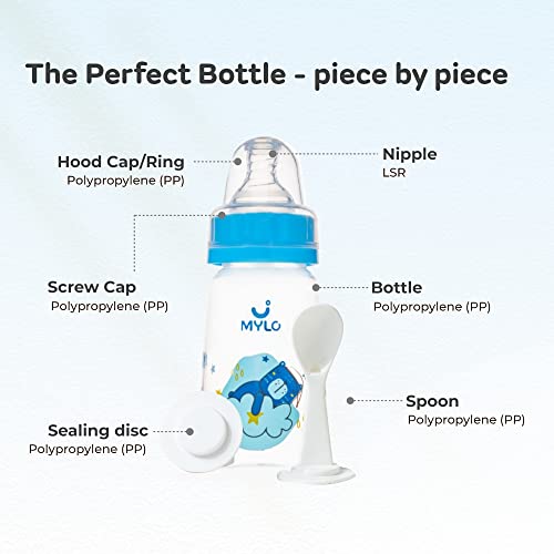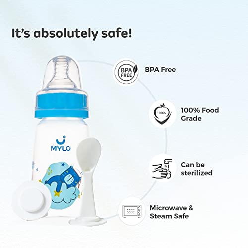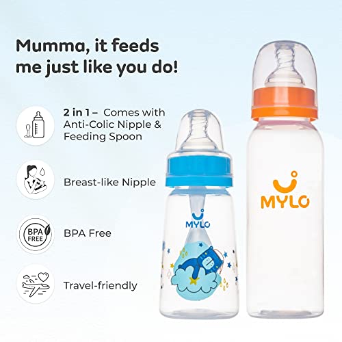 Mylo Baby 2 in 1 Feeding Bottles with Spoon for New Born Baby (125ml + 250ml) | Anti Colic & BPA Free Feeding Bottles | Feels Natural Baby Bottle | Easy Flow Neck Design- Bear + Zesty Orange