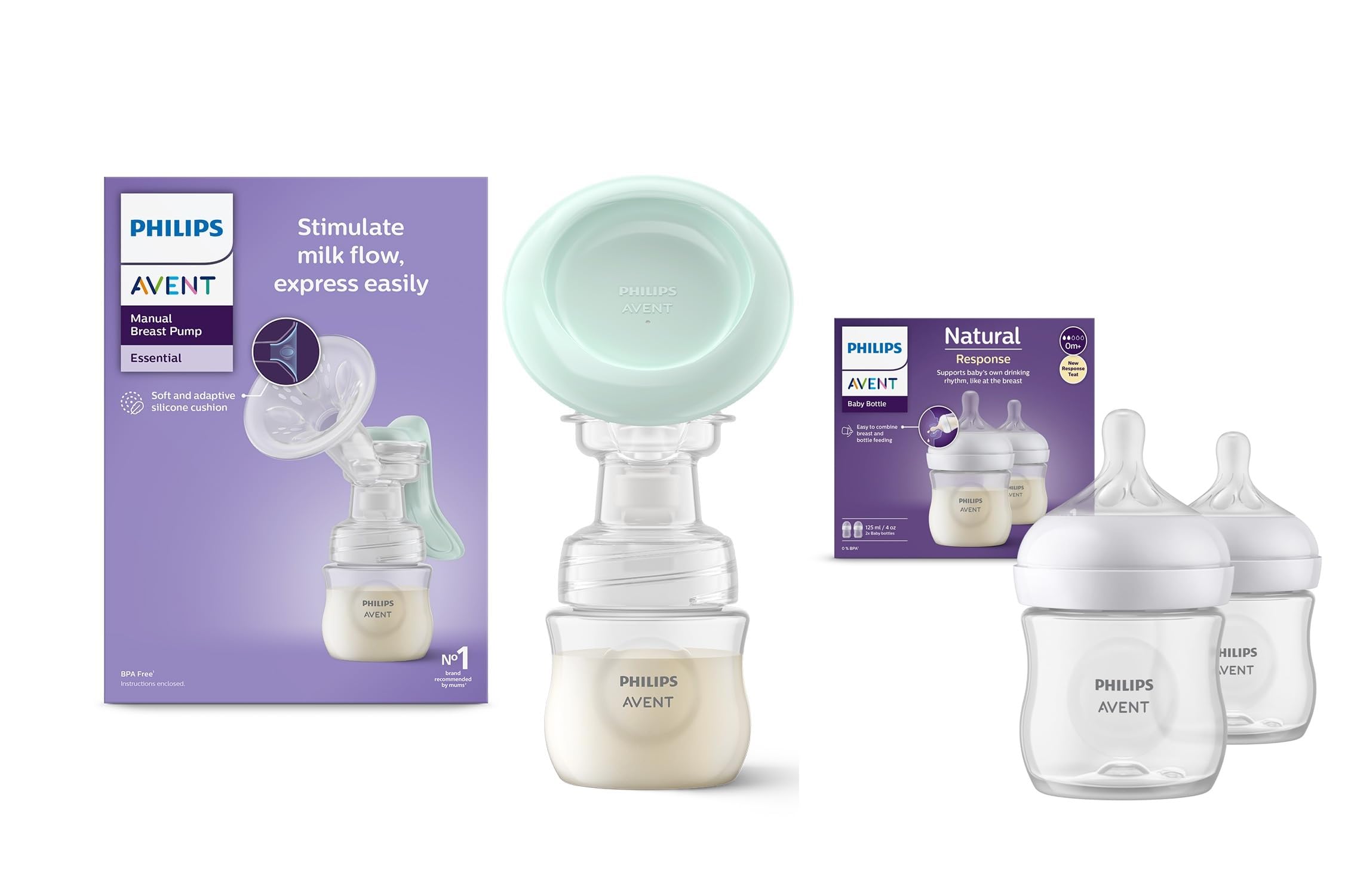 Philips Avent manual pump is both gentle and portable. The small compact pump is easy to take with you wherever you might need to pump both at home or away. This pumps Natural Motion technology is inspired by baby's suckling and massage during breastfeeding for quick milk flow during pumping. In our manual pump the Natural Motion technology gently combines suction and nipple stimulation for quick milk flow. The soft silicone cushion adapts to fit both the size and shape of the breast comfortably. The angle of the pump allows for an upright pumping position thanks to a no lean forward design. The pump has only a few parts and therefore is easy to set-up use and clean. You can pump directly into the 4oz Natural bottle base and then attach the Natural response nipple to feed immediately.