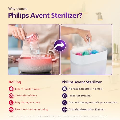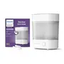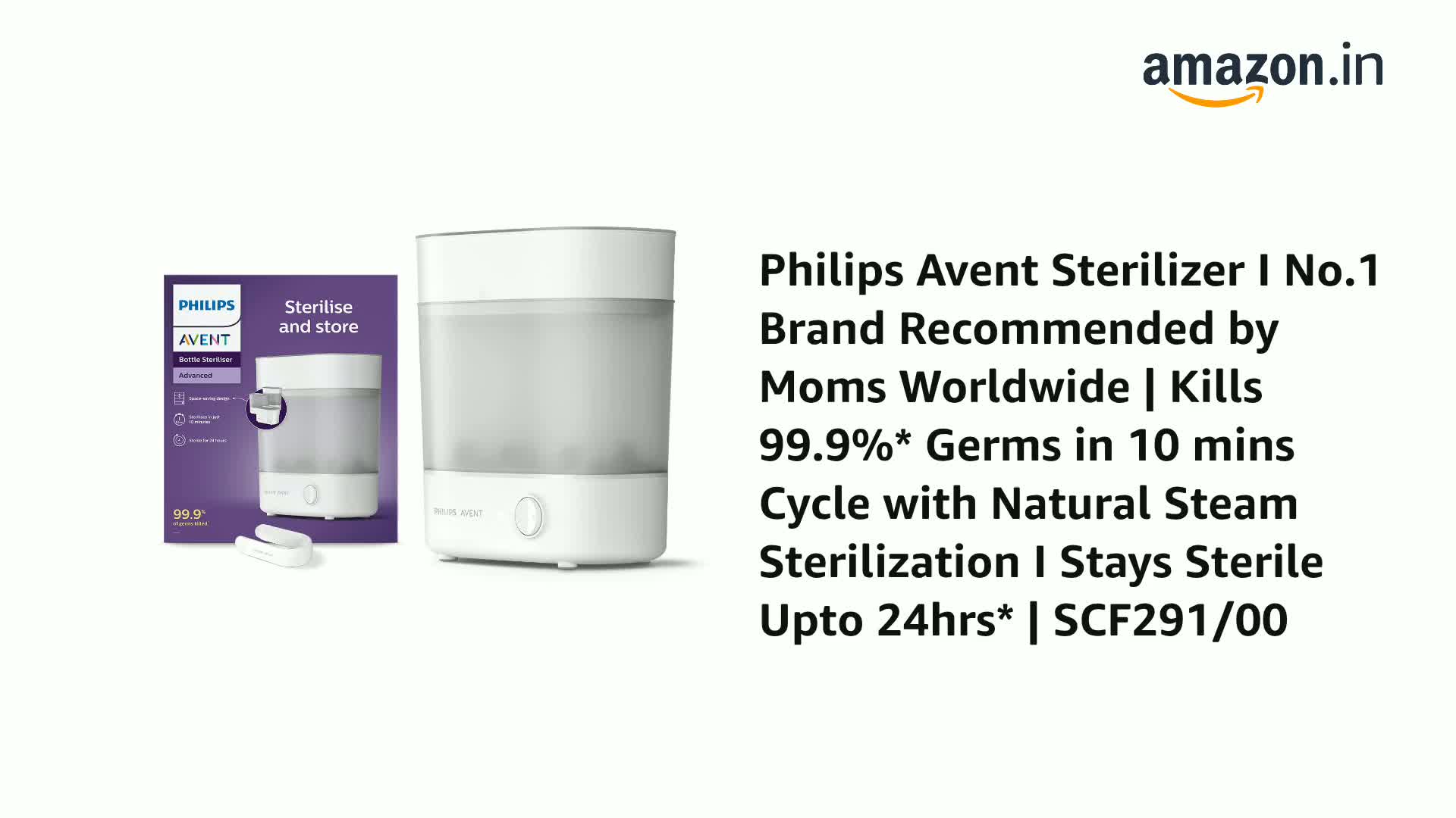 The Philips AVENT SCF291/00 advanced electric steam sterilizer effectively kills 99.9% of germs in just 6 minutes. It sterilizes using steam an effective chemical-free way to protect your baby from harmful germs. The advanced electric steam sterilizer is adjustable giving you the option of a small configuration for pacifiers a medium configuration for breast pumps toddler plates and utensils and a large configuration for up to 6 Philips Avent bottles; and it requires minimal countertop space. To use just add water to the base load and turn on the power. Advanced features such as a 6-minute cycle with automatic shutoff and drip tray to prevent unpleasant odors make it easy to use; and contents remain sterile for up to 24 hours if the lid remains closed. The Philips AVENT Advanced electric steam sterilizer is backed by a full 2-year warranty. With the heating time of 4 minutes the total sterilization cycle is 10 minutes