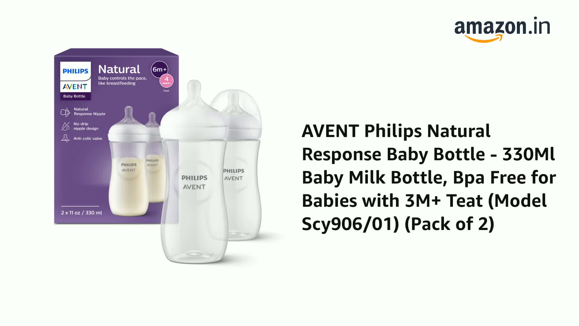 Philips Avent Natural Baby Feeding Bottle | No.1 Brand Recommended by Moms Worldwide | Ideal for 3 months+| Natural Response Technology Mimics Breastfeeding | Uniquely Designed Nipple releases milk only when baby drinks | Pack of 2 | SCY906/02
