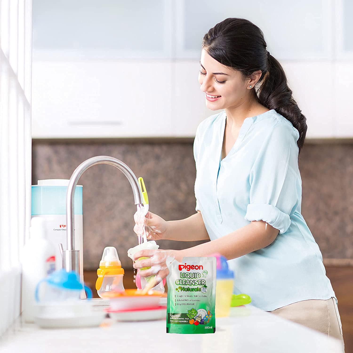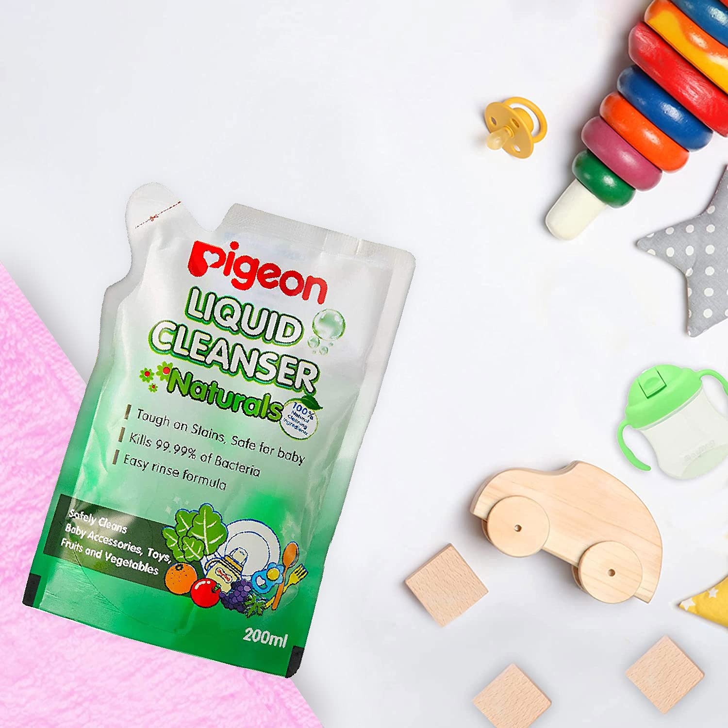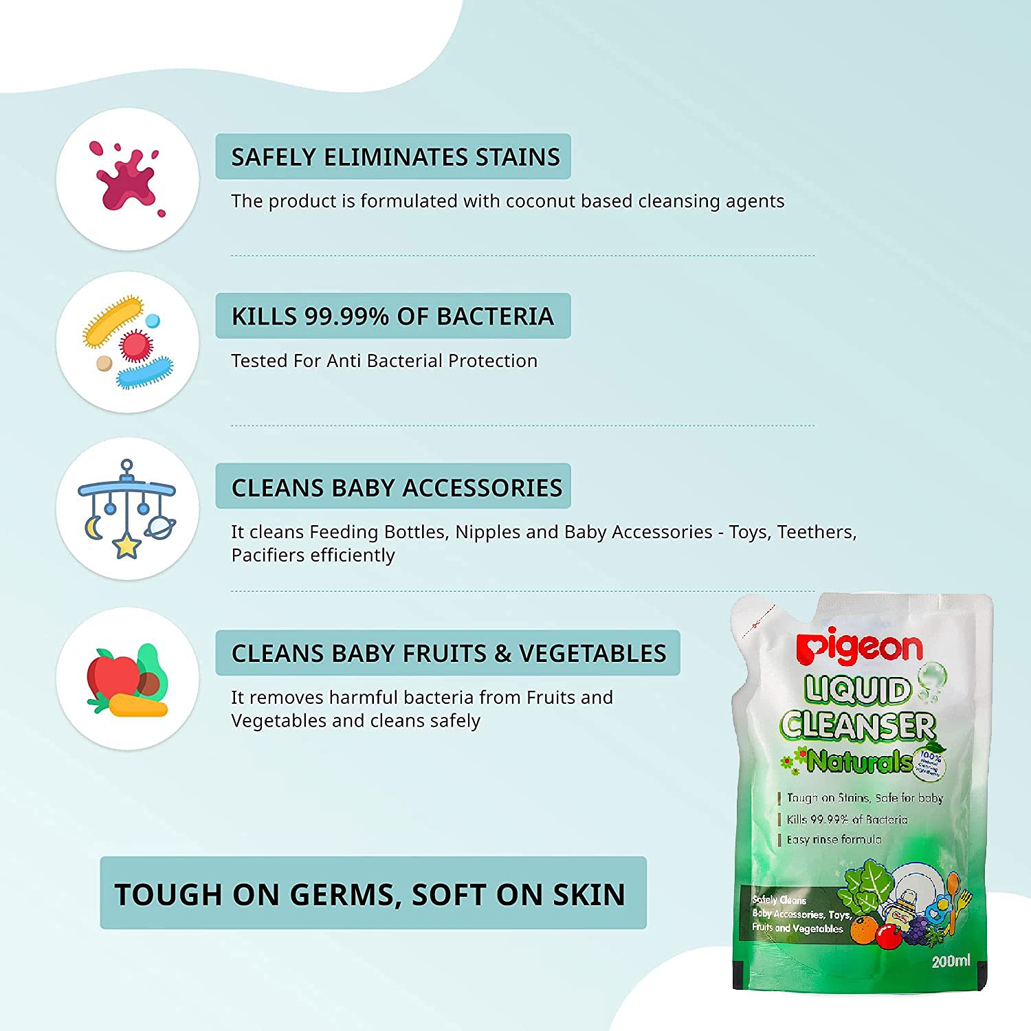 The pigeon bottle nipple and vegetable liquid cleanser is the ultimate natural cleanser and is essential for baby's health. Pigeon liquid cleanser is a tried and tested by mothers all over the world it has proven to be highly effective in killing bacteria found in milk. We are introducing new foam type liquid cleanser for easy cleaning. Kills 99.99 percent bacteria made from 100 percent food grade (edible) ingredients. Ideal for cleaning nursing bottles nipples pacifiers feeding accessories toys as well as food such as vegetables fruits etc. remove even the toughest formula stains but remain gentle to the skin pigeon liquid cleanser is a much stronger and safe wash than regular detergent commonly found in kitchens effectively remove pesticides residue on fruits and vegetables.