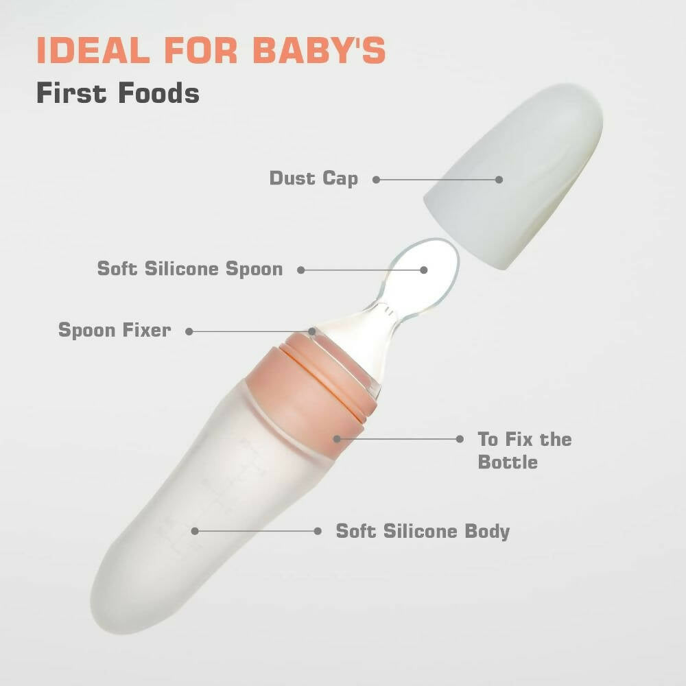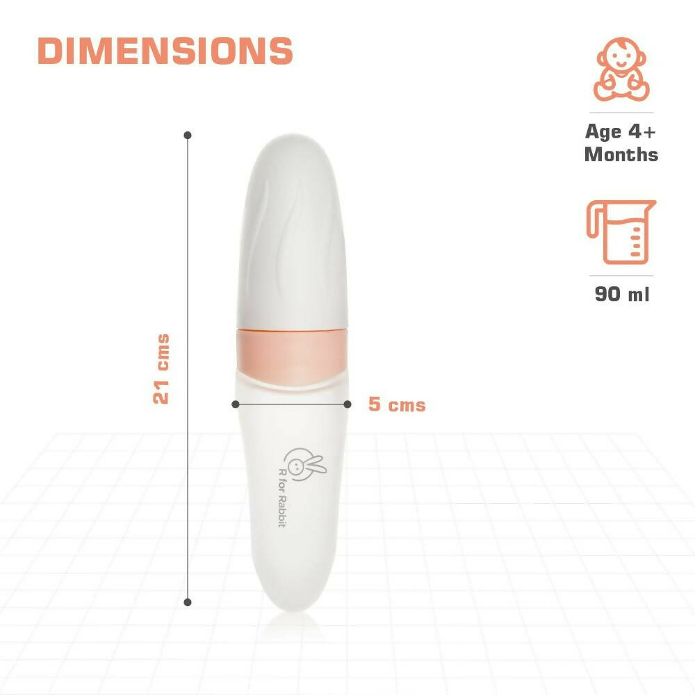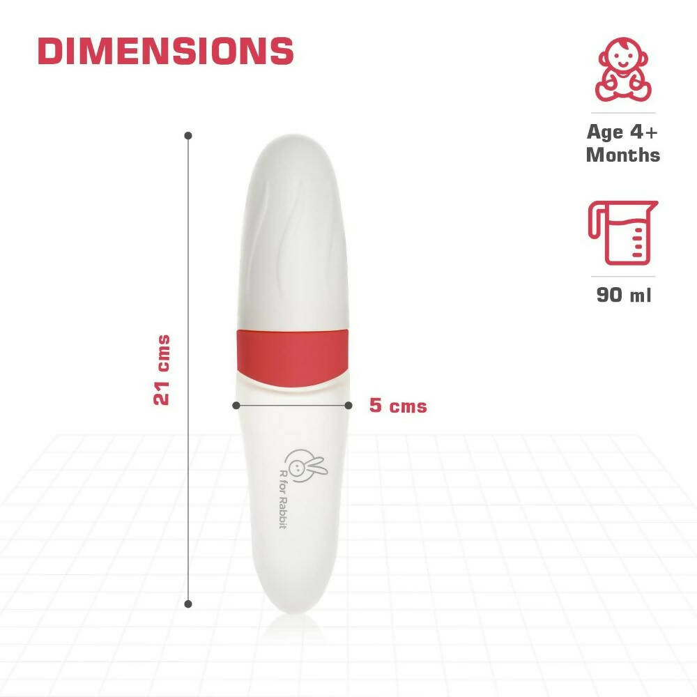 R for Rabbit Premium First Feed Baby Feeding SpoonAbout the Product:Safety 1st: First Feed Silicone Feeder is made of Food Grade Silicone Material which is BPA Free. It's absolutely safe to feed your child.Soft Spoon: Baby feeder comes with soft silicone feeder which makes it easy to intake the food/liquid and will not hurt the babys gumsEasy To Use: First Feed Feeder can be used by simply holding it with one hand and pressing the soft silicone container to bring food on the spoon and feed the baby.Dust cover: It comes with a dust cover to keep the spoon hygienic.For Mix Of Foods: This baby spoon feeder can be used to feed juices, cereal, mashed rice, veggies, all kinds of semi-solids and so on.Legal Disclaimer: Product images are for illustra