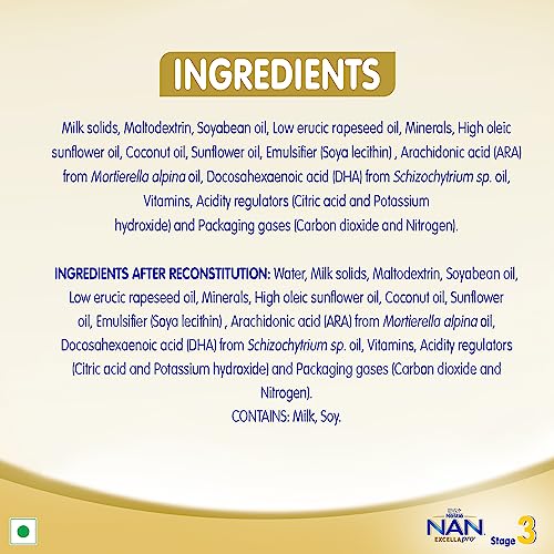 Nestle NAN EXCELLAPRO 3 is a spray dried follow-up formula with DHA ARA Vitamins A C D Calcium Zinc and Iron for infants after 12 months and up to 24 months when they are not breastfed. Nestle NAN EXCELLAPRO 3 contains DHA. DHA helps support normal brain development. Also contains Iron. Iron helps support normal cognitive development. Contains Vitamins A C and Zinc. Vitamins A C and Zinc contribute to normal immune system function. Contains Calcium and Vitamin D. Calcium and Vitamin D help support normal growth and development of bones. 155 years of expertise in Infant Nutrition Nestle develops infant nutrition products backed by evolving science and research. Innovation has been at the heart of Nestle since its beginning. Nestle agrees with the World Health Organization and other medical and health associations that breast milk is the best and the most natural food for babies. Important Notice: Mother's milk is best for your baby.