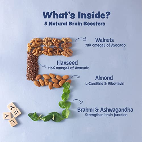 5 NATURAL BRAIN BOOSTERS: Brahmi Almond Walnut Flax Seeds & DHA to boost brain power in kids.