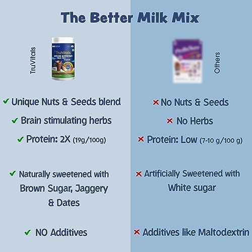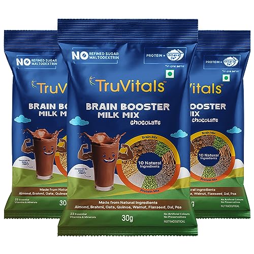 TruVitals Brain Booster Milk Mix Chocolate 90 g | 5 Natural memory & concentration boosting nutrimix of Brahmi Walnut Badam powder Algal DHA Flax Seeds | Protein powder health drink for kids