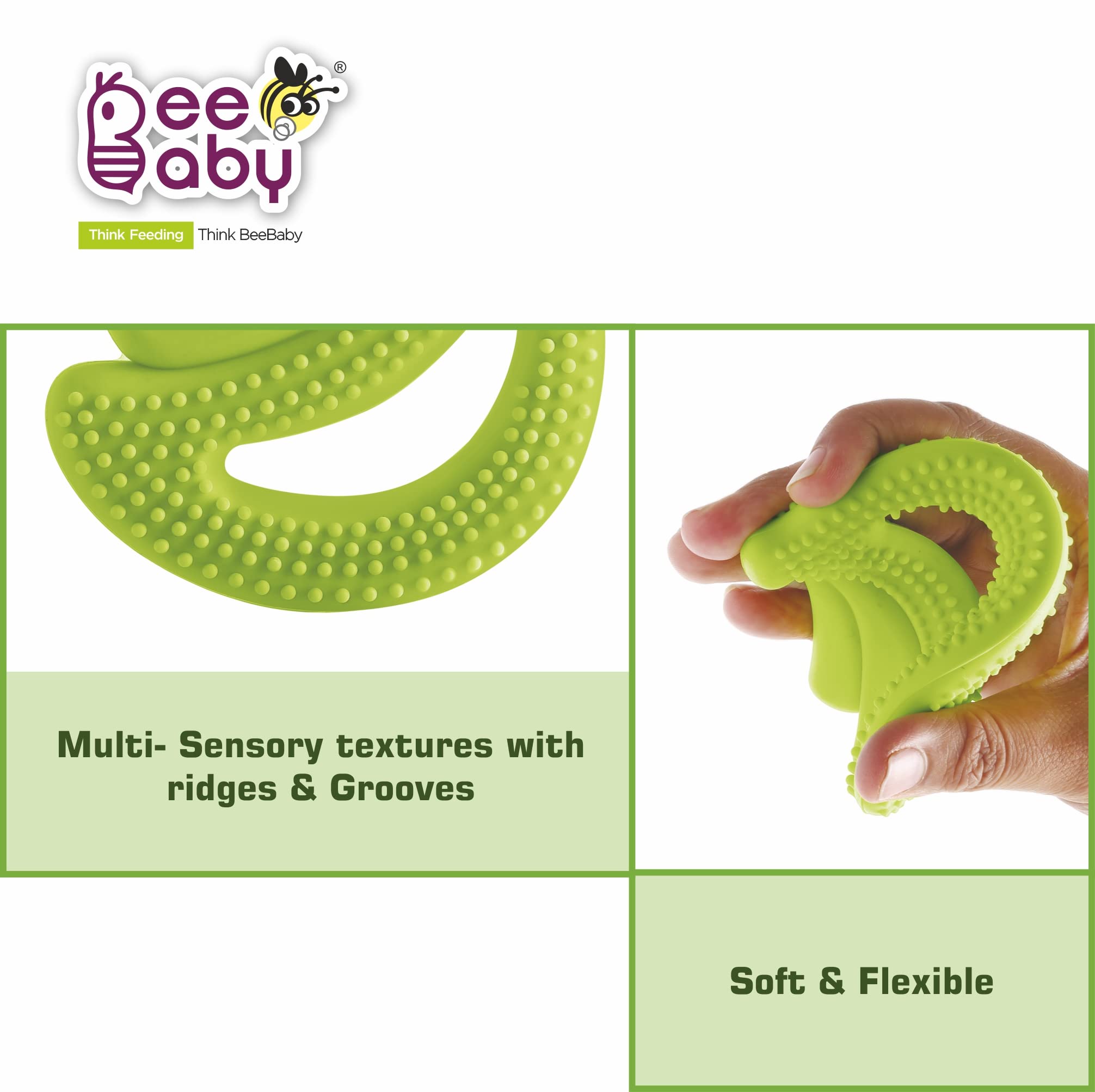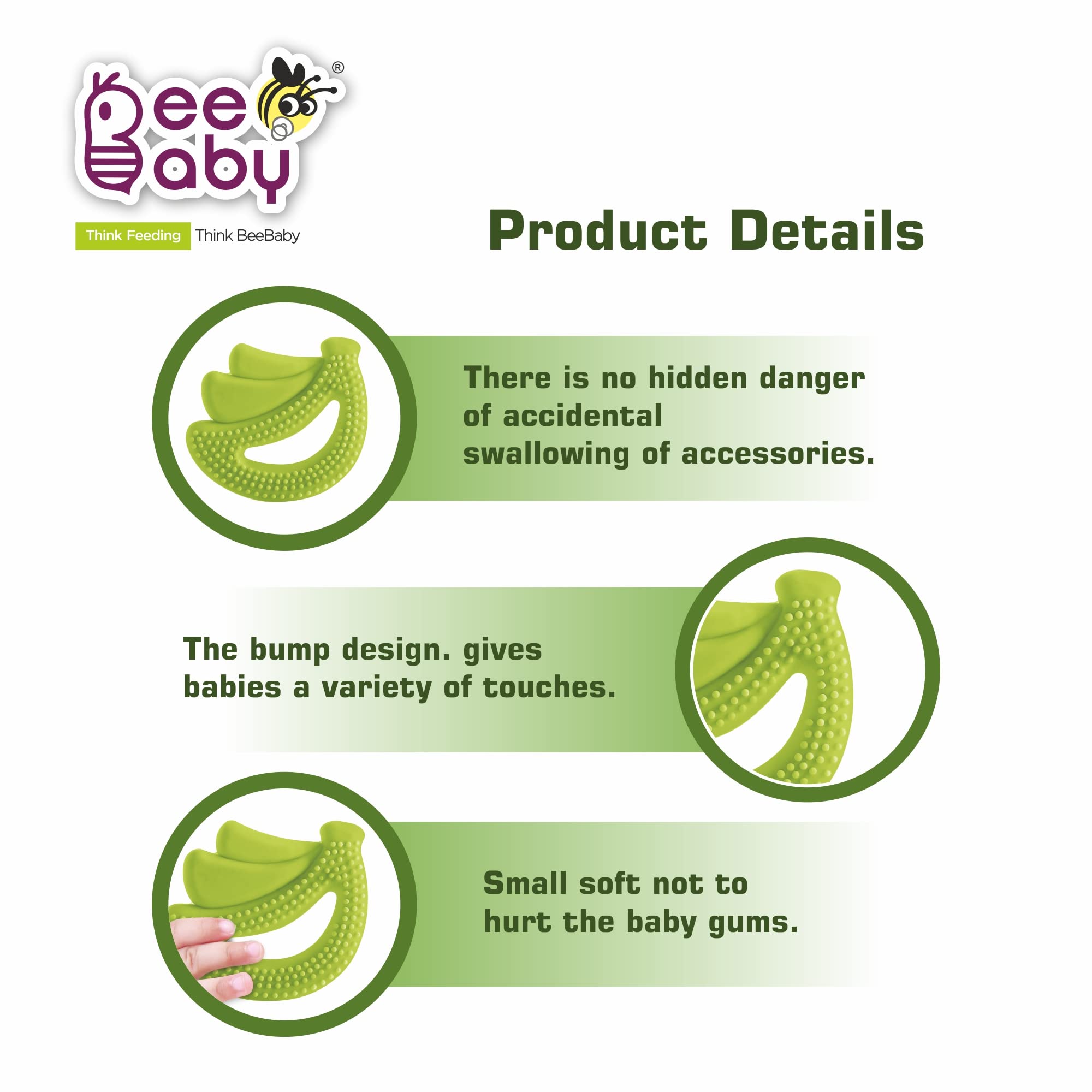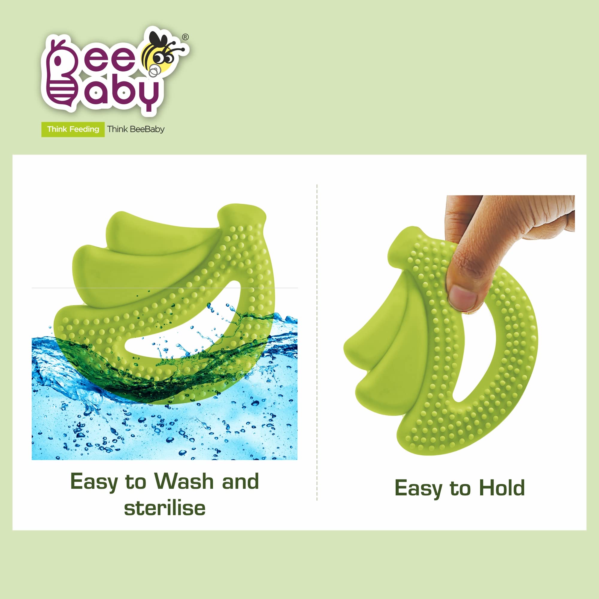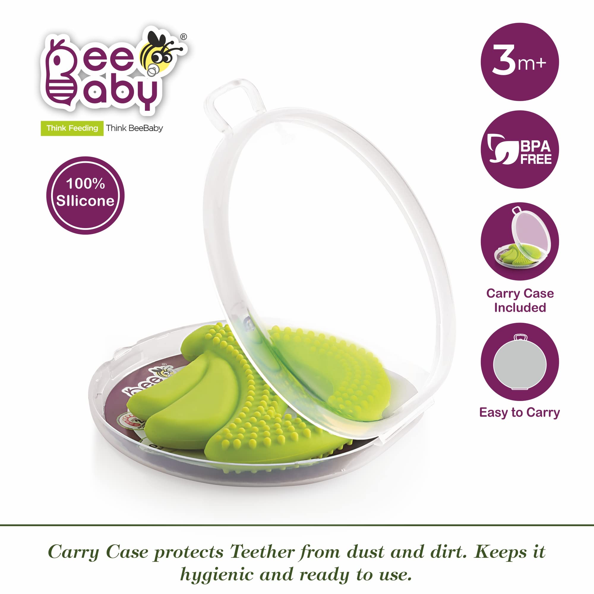 BeeBaby Banana Fruit Shape Soft Silicone Teether for 3-6 Months with Carrying Case BPA Free Teething Toy for Babies with Textured Surface for Soothing Gums. 100% Food Grade (Banana - Green)