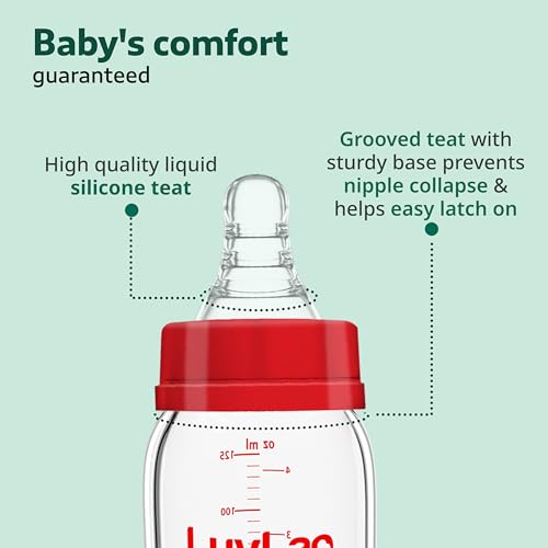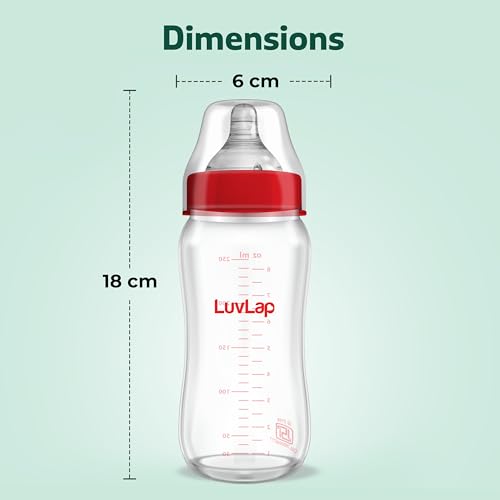 LuvLap Natura Flo Wide Neck glass bottles are manufactured especially for feeding newborns and small children. The bottle has a broad neck a screw-on lid that secures a silicone nipple that lets the infant sip from it just like it would from a breast. In particular for moms who are returning to work or who find it difficult to breastfeed the bottle is frequently utilized as an addition to or a substitute for nursing. Glass bottles are simpler to clean don't retain flavors residues or odours and are more dependable and long-lasting.