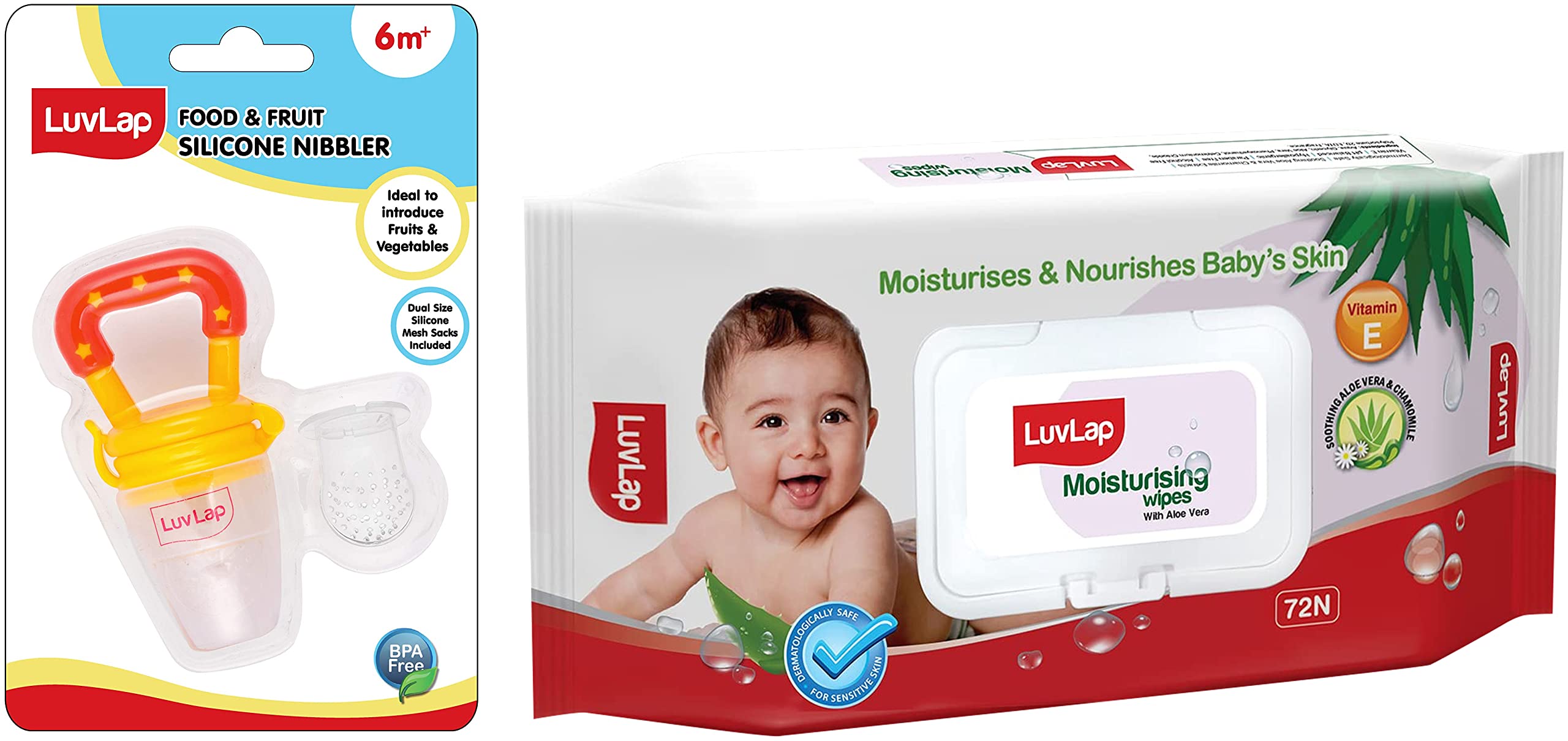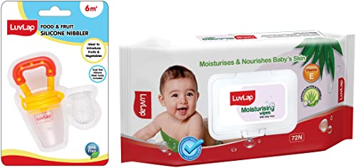 LuvLap Silicone Food/Fruit Nibbler with Extra Mesh Soft Pacifier/Feeder Teether for Infant Baby Infant Joystar Yellow BPA FreeFruit nibbler and teething toy to provide gentle relief to gums. Serves dual purpose of feeding fruit and vegetables to babies and can also be used as a teether. Can be filled with chilled fruits/vegetables to provide added relief. Made with bpa free food grade plastic and soft silicone it comes in attractive handle designs to EN gage the baby and is easy to hold and nibble upon.LuvLap Paraben Free wipes for baby skin with Aloe Vera Fragrance Free pH Balanced Dermatologically Safe Baby Wipes Rich in Vitamin E & chamomile extract 72 Wipes With Lid PackLuvLap Moisturizing Baby Wipes with aloe vera are the perfect wipes for your baby's delicate skin. Enriched with the goodness of Aloe Vera & Chamomile they are completely free of alcohol and harmful parabens. The pack also comes with a lid seal to ensure the quality remains consistent over time. After all your baby's safety is our prime concern.