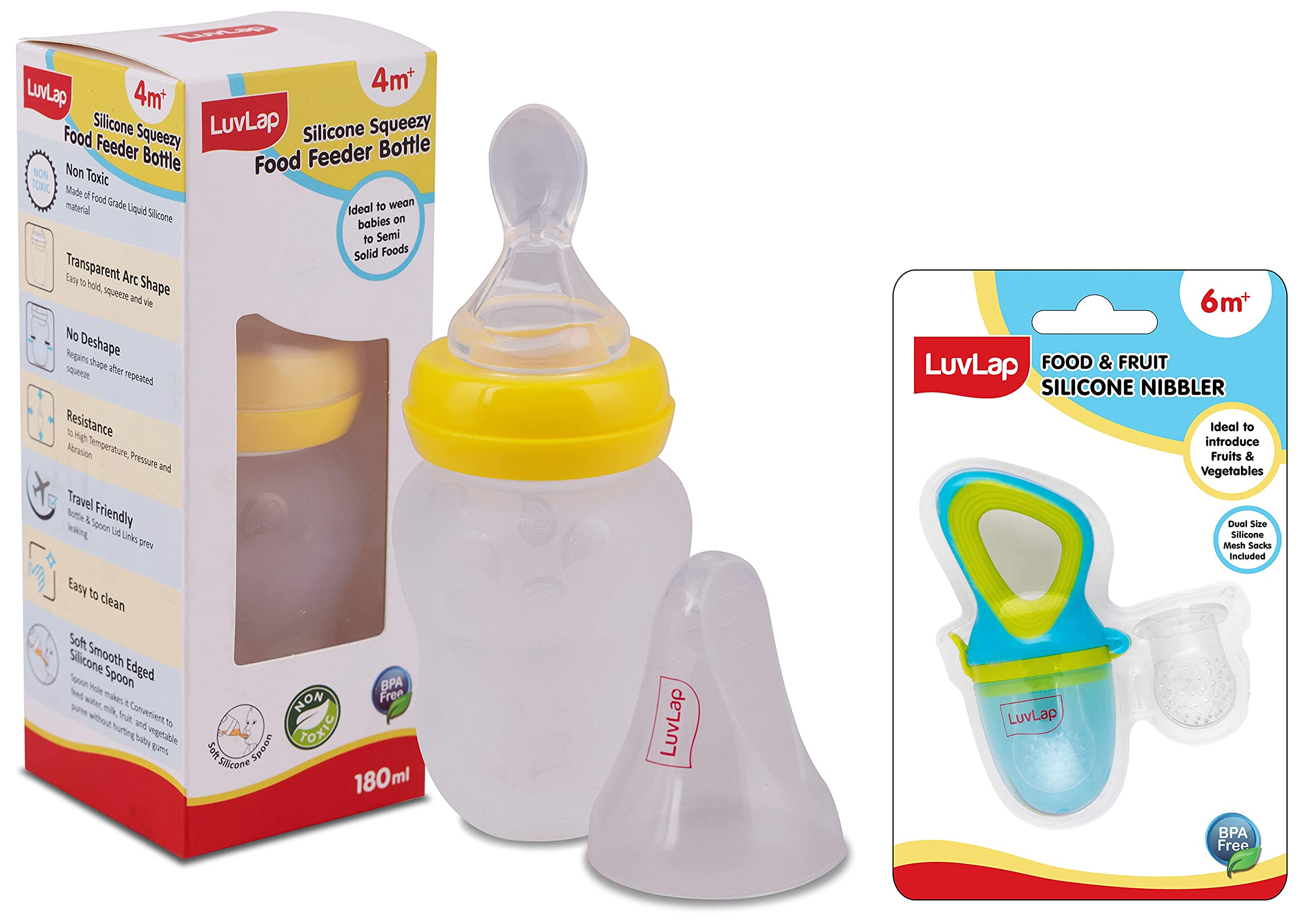 LuvLap Silicone Food/Fruit Nibbler with Extra Mesh Soft Pacifier/Feeder Teether for Infant Baby Infant Elegant Blue BPA FreeFruit nibbler and teething toy to provide gentle relief to gums. Serves dual purpose of feeding fruit and vegetables to babies and can also be used as a teether. Can be filled with chilled fruits/vegetables to provide added relief. Made with bpa free food grade plastic and soft silicone it comes in attractive handle designs to EN gage the baby and is easy to hold and nibble upon.LuvLap Baby Silicone Finger ToothBrush with case for Easy Cleaning Massaging and Soothing Gums Oral HygieneMade from Non Toxic Liquid Silicone. Gently cleans your baby's teeth and gum. Provides relief to the child's tender gums during teething. Includes case for storage and to maintain hygiene.