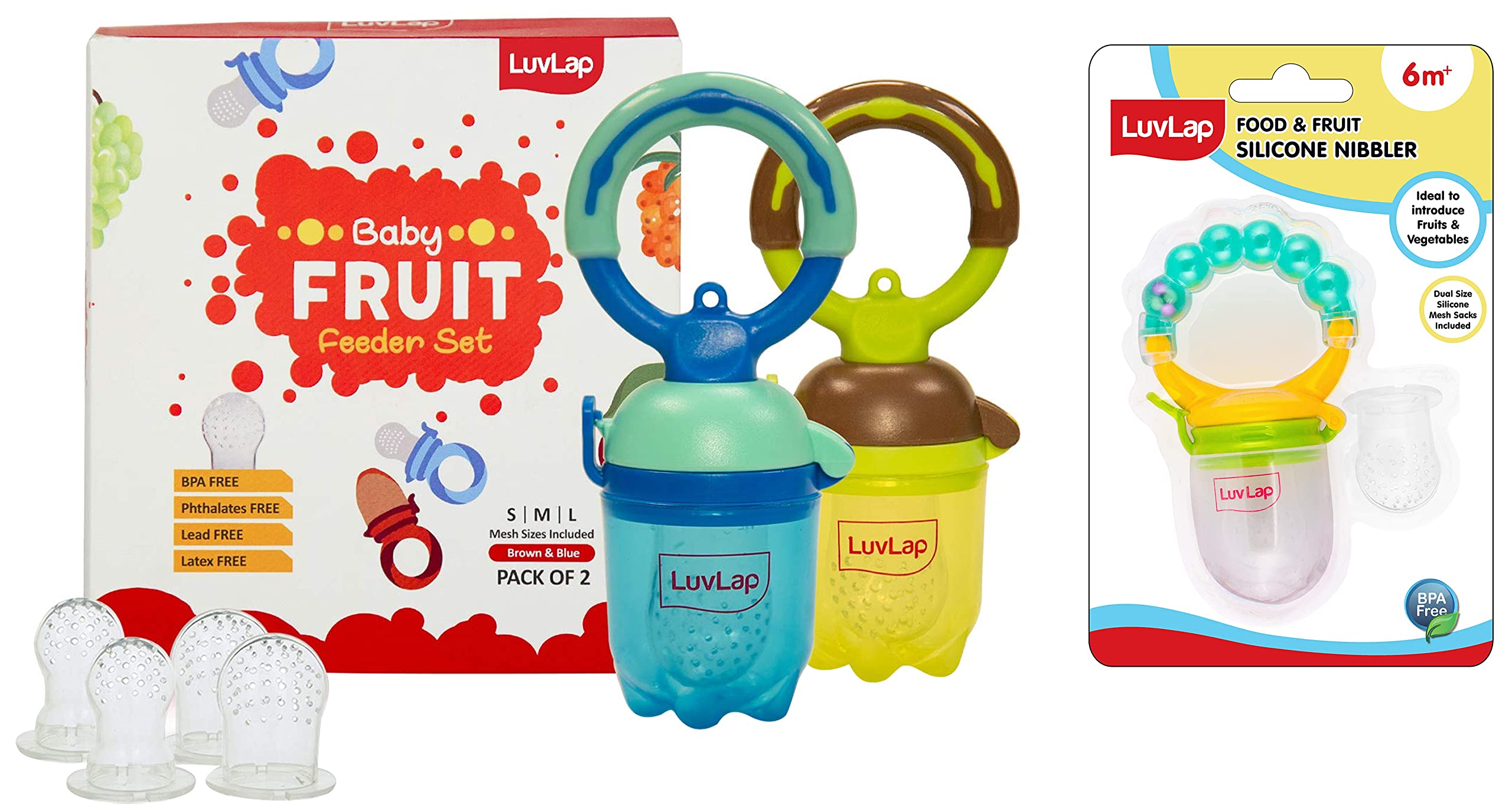 LuvLap Silicone Food/Fruit Nibbler with Extra Mesh Soft Pacifier/Feeder Teether for Infant Baby Infant Pearly Green BPA FreeFruit nibbler and teething toy to provide gentle relief to gums. Serves dual purpose of feeding fruit and vegetables to babies and can also be used as a teether. Can be filled with chilled fruits/vegetables to provide added relief. Made with bpa free food grade plastic and soft silicone it comes in attractive handle designs to EN gage the baby and is easy to hold and nibble upon.LuvLap Baby Food and Fruit Feeder Twin Pack with Three Feeder Sack Sizes BPA Free Brown and BlueLuvLap Baby food and fruit feeder twin packs are availble in attractive colors ergonomic designs and makes baby's introduction to solid food and feeding to weaning babies an easiser job. The pack contains 3 different sizes of feeder sack to meet the growing consumption need of the babies