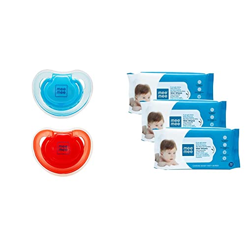 Mee Mee Soft Nipple Baby Pacifier (Red/Blue)Pacifiers give babies oral stimulation soothe them in between feeds and also reduce discomfort they experience during the teething phase. Mee Mee's pacifier is especially useful for preventing tongue thrush and also acts as a supportive aid in developing your baby's shape of jaw and palate.Mee Mee Baby Gentle Wet Wipes ((72 PcsPack of 03) Aloe Vera Wet Wipes)Diaper change can often tend to be a messy affair. But your baby will soon be potty trained and you will be a proud parent! Till then Mee Mee's Caring Baby Wet Wipes are a handy way to keep your baby refreshed and clean easily. Non-toxic and hypoallergenic the wipes are entirely safe for everyday use. Regular wipe-down with a diaper change keeps your baby fresh and comfortable which means uninterrupted happy moods! Made of spunlace and non-woven fabric Mee Mee's Caring Baby Wet Wipes are thick to make cleaning up easy and efficient. Enriched with the goodness of Aloe Vera they also moisturize as they clean. 100% bacteria and alcohol free Mee Mee's Caring Baby Wet Wipes are manufactured as per the international norms of safety and hygiene to deliver only the best for your baby.
