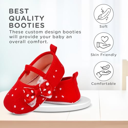 Quality Material (Soft and Breathable): Crafted with premium materials these baby booties provide a soft and breathable haven for your little one's tiny feet. Playful Touch: Infused with a playful touch our baby booties add a delightful charm to your baby's adorable ensemble. Lightweight: Designed to be feather-light these booties ensure that your baby can move with ease and comfort. Easy to Put On and Take Off: With a user-friendly design these booties make dressing up your baby a breezeâeasy to put on and effortless to take off. Anti-Slip Design: Enhanced with an anti-slip feature these booties provide stability and security for your little one's early steps.