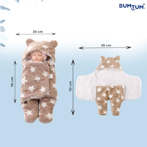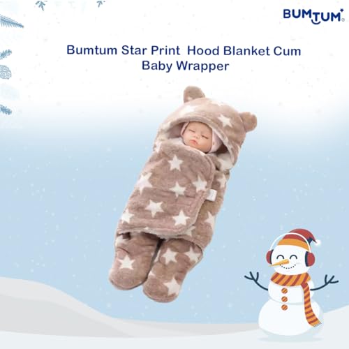 Bumtum 3-in-1 Hooded Baby Soft Blanket Wrapper| Swaddle for New Born Babies(Boys & Girls) 0-6 Months, Travel-Friendly, Star Printed (Biege)