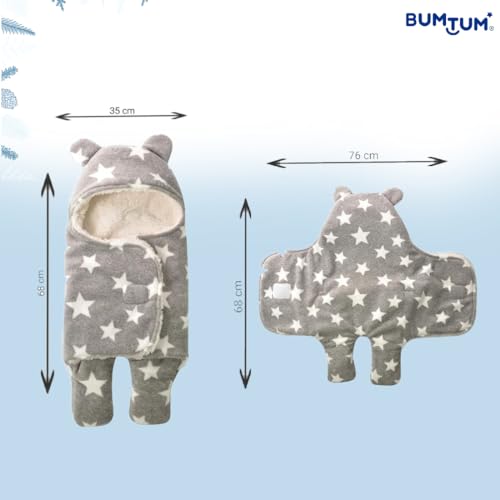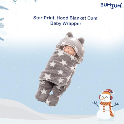 Bumtum 3-in-1 Hooded Baby Soft Blanket Wrapper| Swaddle for New Born Babies(Boys & Girls) 0-6 Months, Travel-Friendly, Star Printed (Grey)