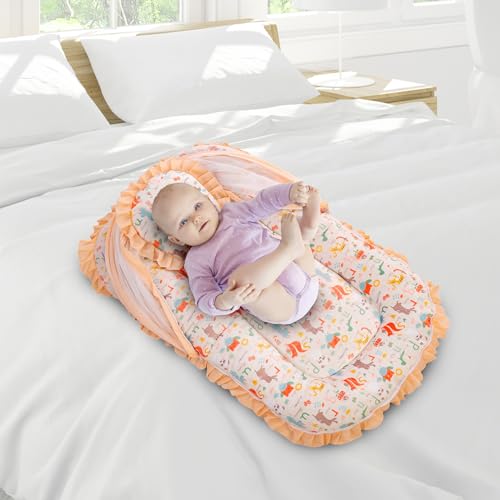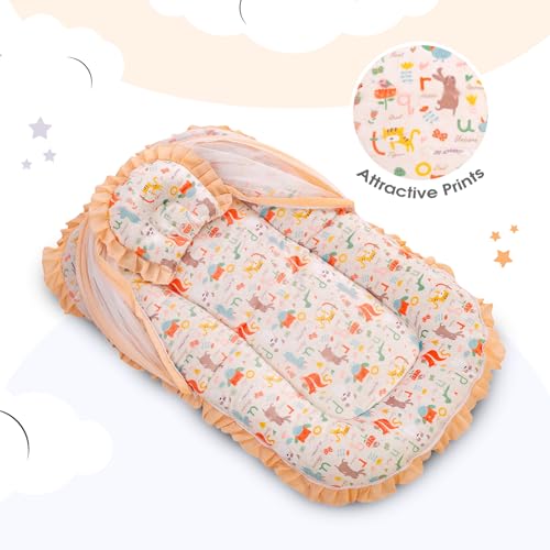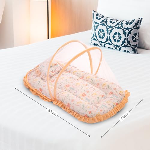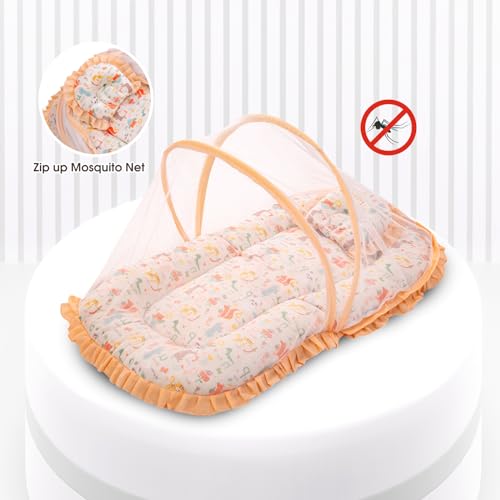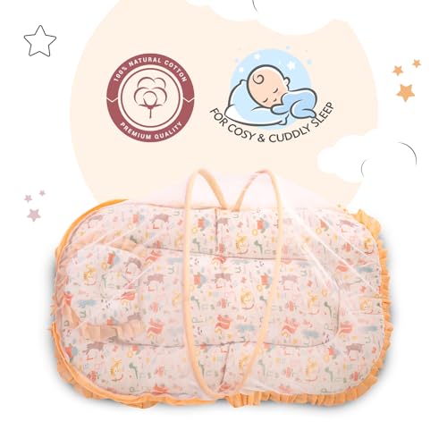 Mee Mee Cushioned Baby Mattress Set with Mosquito Net & Pillow in a delightful colors this set is designed to provide unparalleled comfort and protection for your baby. The mattress made from premium-quality breathable fabric ensures a gentle and soothing sleep with plush cushioning that supports your baby's delicate body. The integrated mosquito net crafted from fine durable mesh offers a secure barrier against insects ensuring undisturbed rest. Included in the set is a matching pillow filled with hypoallergenic materials providing gentle head and neck support. Easy to clean and maintain this portable and practical mattress set is perfect for both home and travel offering a cozy and safe sleeping environment for your baby.