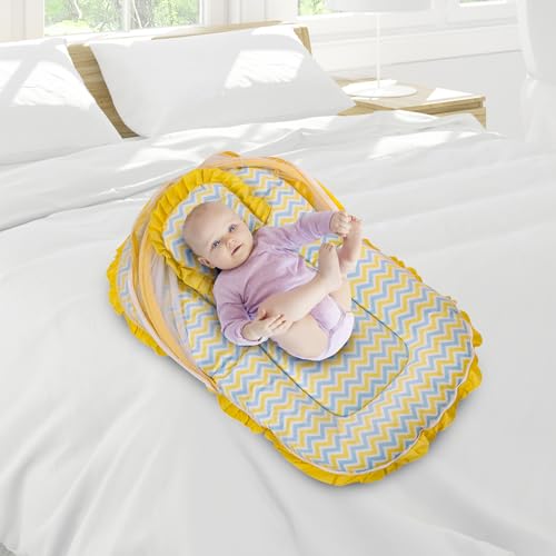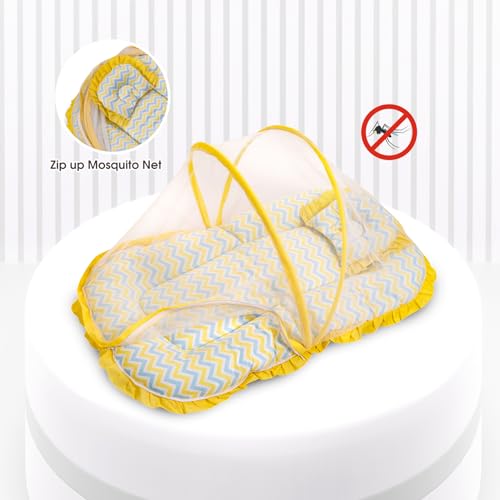 Mee Mee Cushioned Baby Mattress Set with Mosquito Net & Pillow in a delightful colors this set is designed to provide unparalleled comfort and protection for your baby. The mattress made from premium-quality breathable fabric ensures a gentle and soothing sleep with plush cushioning that supports your baby's delicate body. The integrated mosquito net crafted from fine durable mesh offers a secure barrier against insects ensuring undisturbed rest. Included in the set is a matching pillow filled with hypoallergenic materials providing gentle head and neck support. Easy to clean and maintain this portable and practical mattress set is perfect for both home and travel offering a cozy and safe sleeping environment for your baby.