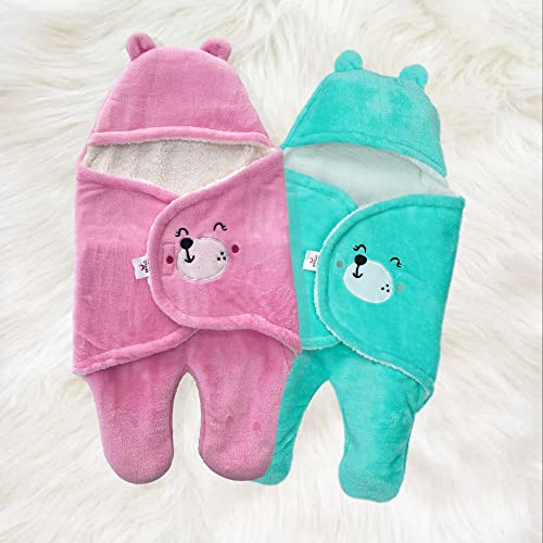 Mylo Baby Ultra-Soft Cute Baby Pack of 2 |Swaddling Wrapper |All Season Ac Blanket-Multipurpose | Hoodie Teddy Bear|0-6 Months (Light Pink+Mint Green)