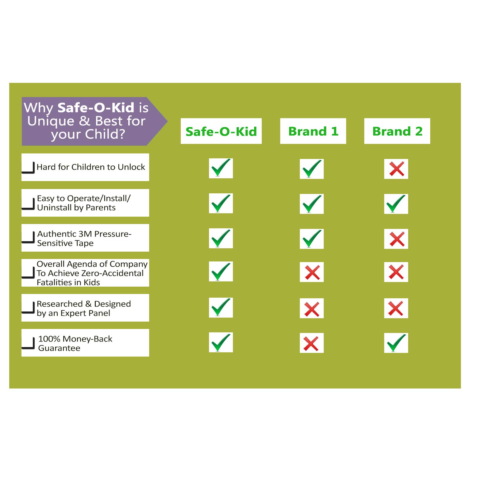 Safe-O-Kid Locks are designed to keep your child safe and secure from harm. Made with high-quality materials these locks are easy to install and can be used on all types of cabinets cupboards drawers and almirahs. The locks are perfect for parents who want to ensure their child's safety and prevent accidents caused by curious little hands. They are sturdy and durable ensuring long-lasting protection for your child. One of the key features of Safe-O-Kid is easy-to-use mechanism. The locks are designed to be simple and intuitive making it easy for parents to secure cabinets and drawers with ease. They are also designed to be child-resistant making it difficult for little ones to open them. These locks are versatile and can be used in a variety of situations. They are ideal for use in the kitchen bathroom bedroom and any other room where dangerous objects or hazardous materials are kept. With Safe-O-Kid Locks you can have peace of mind knowing that your child is safe and secure at all times. In addition to their practicality and ease of use Safe-O-Kid Locks are also aesthetically pleasing. They blend seamlessly with the decor of your home and their sleek and modern design adds a touch of elegance to your cabinets and drawers. Overall Safe-O-Kid are an essential safety accessory for parents with young children. They offer a practical and effective solution to keeping your child safe and secure from harm without compromising on style or functionality.