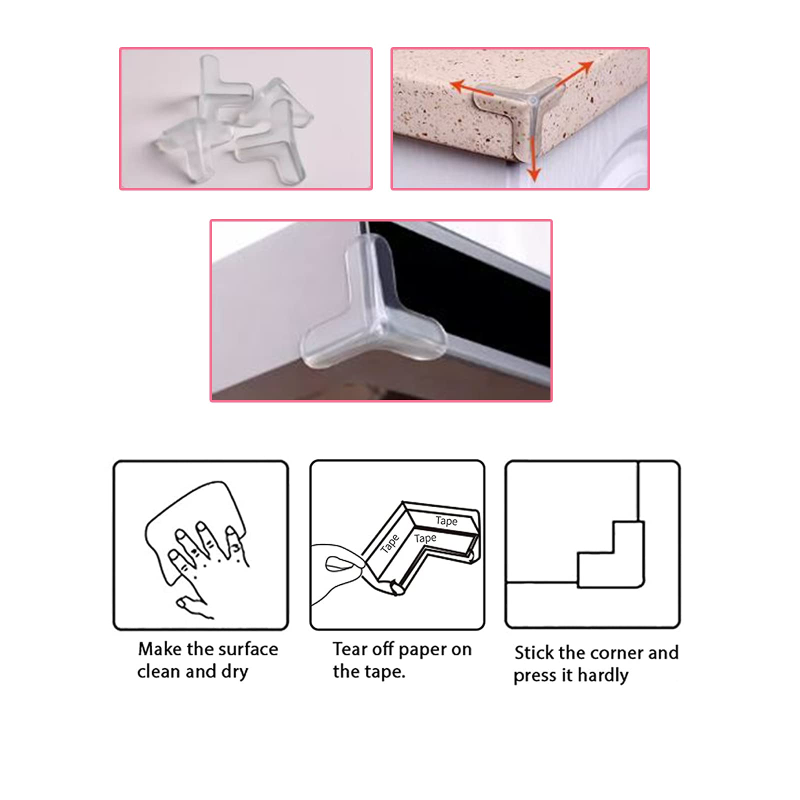 " How to use 1. Clean the corner surface as well as Safe-o-KidCorner Cushioninner surfaces using any ordinary home cleaning solution. Wipe it dry. 2. Peel off the double-sided 3M tape from the Corner Cushion. 3. Remove the 3M backings from the four pieces of tape applied to the Corner Cushioninner surfaces. 4. Carefully align so the Corner Cushion fits perfectly with the cornersurface without leaving any space. 5. Press tightly and hold Corner Cushion against the surface for at least one minute. "
