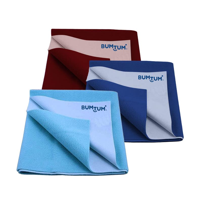 HomeBabyNurseryCrib SheetsBumtum Baby Dry Sheet Waterproof Quick Soft Fleece Baby Bed Protector |Anti - Bacterial, Extra Absorbant, Reuseable & Washable (Maroon + Royal Blue + Aqua Blue Combo, Large Size, Pack of 3)