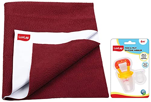 LuvLap Silicone Food/Fruit Nibbler with Extra Mesh Soft Pacifier/Feeder Teether for Infant Baby Infant Joystar Yellow BPA FreeFruit nibbler and teething toy to provide gentle relief to gums. Serves dual purpose of feeding fruit and vegetables to babies and can also be used as a teether. Can be filled with chilled fruits/vegetables to provide added relief. Made with bpa free food grade plastic and soft silicone it comes in attractive handle designs to EN gage the baby and is easy to hold and nibble upon.LuvLap Instadry Anti-Piling Fleece Extra Absorbent Quick Dry Sheet for baby Baby Bed Protector Waterproof baby sheet Small size 50x70cm Pack of 1 MaroonLuvLap instadry extra absorbent sheet come with soft and breathable material lightweight and easy to carry.