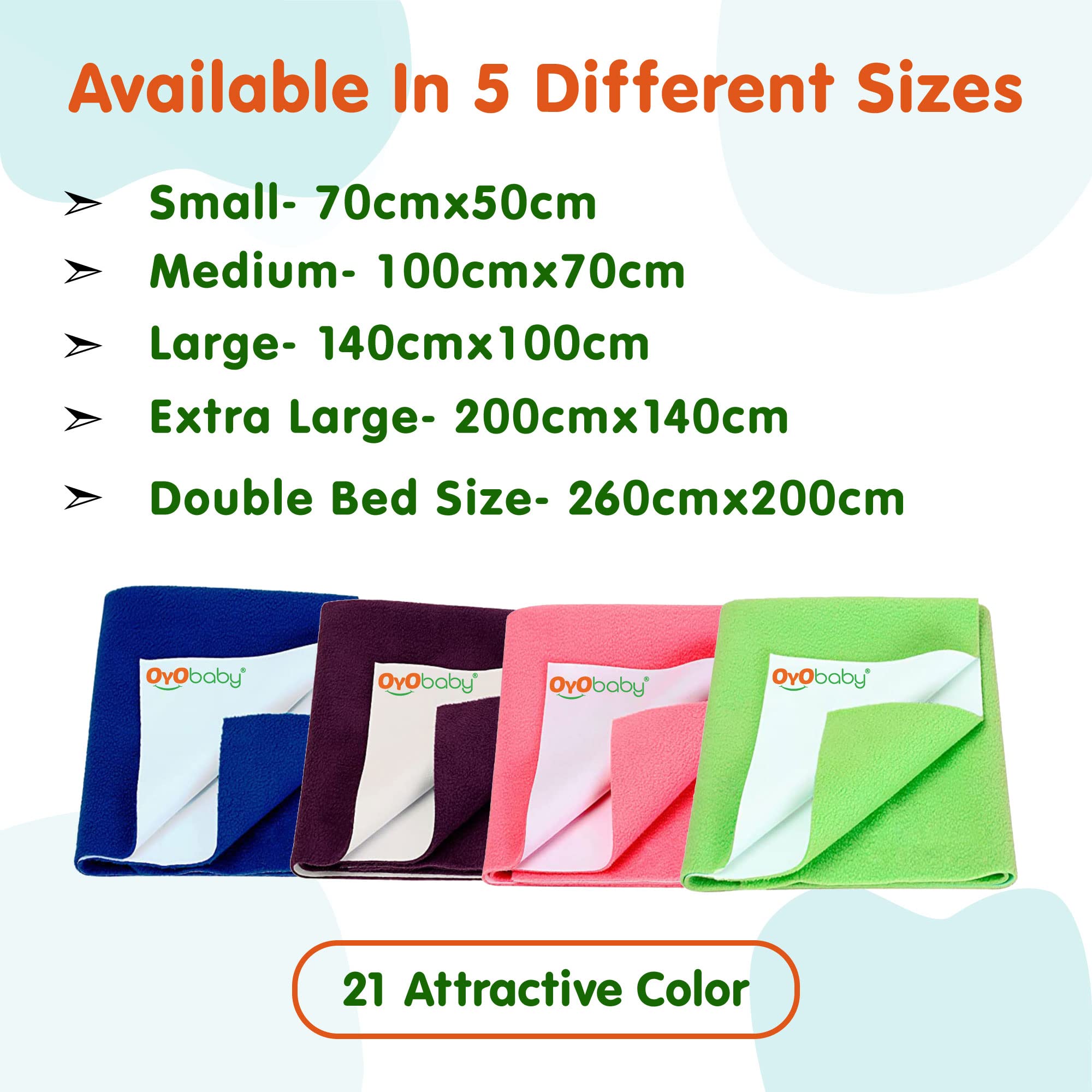 Peace of mind: OYO BABY waterproof under mats will provide excellent protection against fluids urine perspiration allergens dust mites and bacteria. It is 100% waterproof yet breathable comfortable and noiseless. The mat is vinyl (pvc) free and safe to sensitive skins. Silky smooth and soft to the touch: OYO BABY mattress under mat is covered by quality cotton fiber and high absorbent fiber liner which allow the mat to feel exceptionally smooth on the skin even after Repeated uses and washes. Breathable and noiseless barrier: unlike traditional waterproof mats that use vinyl (pvc) as barrier OYO BABY under mats use a safer material called TPU. TPU is noise free and totally breathable. TPU also prevents microorganisms and molds as well as dust mites ideal for ultimate allergy relief. Extremely versatile: no matter you are at home or on-the-go and travel put it on a bed a chair a sofa or on your lap use it for your toddler elderly parents this waterproof mat gets the job done. In addition to be mattress sheet cover it can also be used in the bassinet cradle crib and changing table as a changing mat cover or changing mat liner. Durable: OYO BABY waterproof mat features 3 layer construction with soft cotton fiber surface noiseless waterproof barrier middle layer and super absorbent fiber liner. The mat is machine washable. Machine wash at warm or cold temperature and tumble dry low only hang dry is recommended.