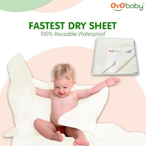OYO BABY baby dry sheet is made of best waterproof material and highly absorbent fibre. Provides freedom to enjoy uninterrupted sleep for longer periods. It is with quick dry technology that dries faster. Feel the diaper free night and rush-free skin cosy smooth and silky feeling. This waterproof mattress protector has cosy soft and smooth top surface for baby to have sound sleep all night with maximum protection. OYO BABY quick dry bed protector sheet Moreover it is skin friendly and heat-free soft and unique multi-layer noiseless fabric sheet. It is an alternative to PVC rubber mats. Highly hygienic and breathable water proof sheet which is durable reusable economical and light weight. This amazing baby bed protector sheet is ready to use anywhere you go. This baby dry sheet is delicate spongy associated water-proof on these lines creating the tangle usable for babies and grown-up. Made up natural colour dyes which are best for babies. Further this perfect dry sheet for babies protects bed from obtaining wet. So offer your baby the liberty to pee on the bed and let them sleep for extended hours. This sheet from OYO BABY is an absorbent & water proof. It stops the piss or any liquid from getting in your mattresses. It dries quickly so you don't have to be compelled to amendment the sheets once more & again. Conjointly it holds eight times water then its weight. Also it is available in 4 different sizes - Small Medium Large & Extra Large. For example if you want dry sheet for baby for double bed then you dont have to worry we are having the best baby dry sheets here.